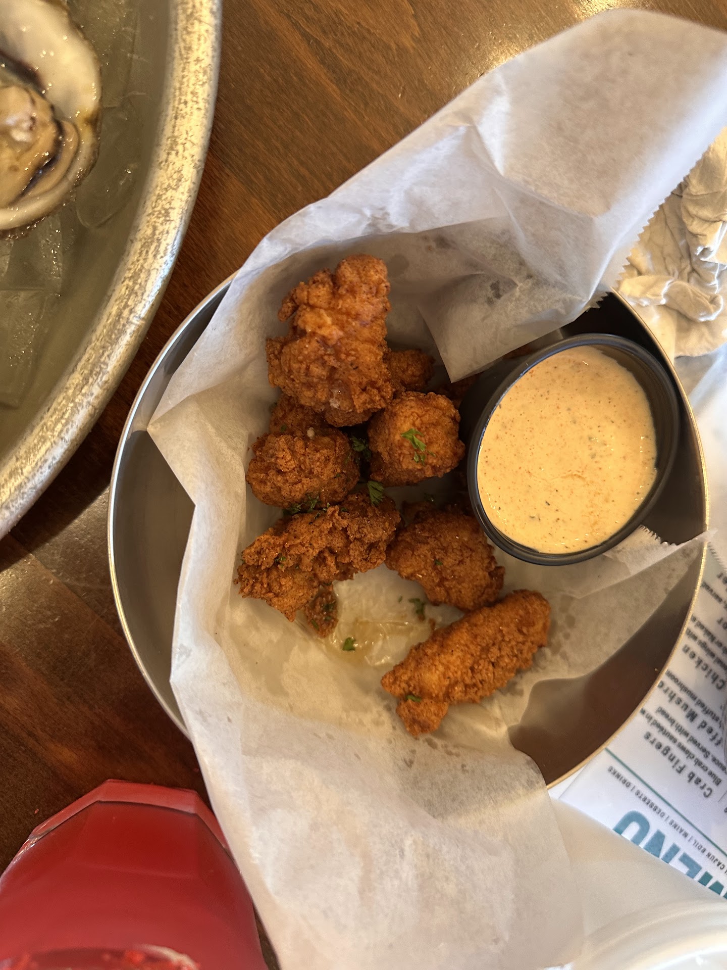 Catfish: was a clean fish. Tasted relatively fresh. The batter would not stick to the fish at all..much of the filet would slide out. It was also overcooked. The batter wasn’t really seasoned. Too dark, not enough cornmeal for my tastes in the batter.