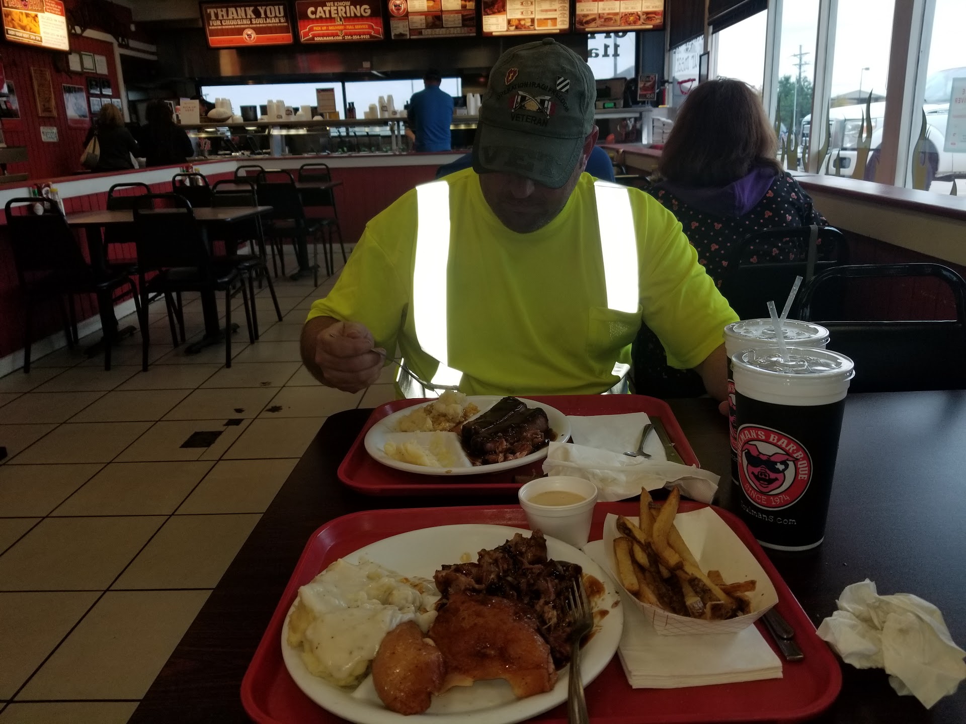 We were there on July 2nd at about 8pm. There were not many customers, but the service was very slow. It took the girls way too long to make our dishes. They were very disengaged and seemed confused on what to do. The food in the first window looked good but when we sat down to eat we were disappointed. The brisket was not really warm, it was dry and only a bit tasty. It should of had more of a smoky flavor. The side dishes were almost gone. Almost every container at the counter was empty and what was in there looked old, crusty and dried up. We asked about getting more freshly made but they said it would take a long time. The comments from others at our table were about the same, not warm to cold food, bland, not good. The ice tea they gave us was very weak. When I asked why it was so weak the girl behind the counter said it was old. I asked if they had fresh tea and she said yes and went and got another jug. Since she knew the tea was old and weak she should have got new fresh tea without having to be asked. They were also out if napkins. How does a restaurant run out of napkins? The restaurant looked dirty as well. Floors, walls, ceilings looked nasty. The cold air return vents in the ceiling were heavily coated with dirt like they had never been cleaned since this place opened up. We will definitely never come back to...