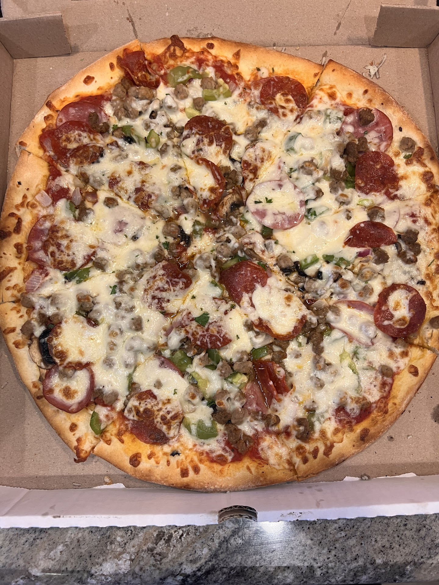 Got to my car, and opened up the boxes and everything was room temperature. Seemed they finished the pizza way before the time it said on the app and they never noticed Uber Eats the pizza was ready for pickup. Seems like a pretty simple oversight, but I assume their are people from other locations on site so this shouldn't have happened. My drive home was about 9 minutes. The pizza was cold. Hard cheese and all.