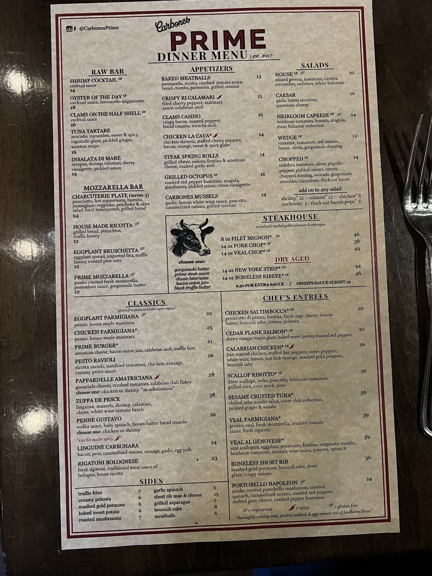 This is the best spot I have ever been to. We discovered this place after a day at the aquarium and it was around 4pm. We were under dressed, wife wanted steak and my daughter wanted pizza. If they couldn't have given me a harder assignment , so here I am browsing a list of food spots trying to actually find a spot that serves steak and pizza. After browsing 20+ spots, I came across Carbone Prime. They actual served pizza and steak, perfect, but then I saw the $$$. Great, I thought, looking down at my sweat pants and t-shirt. After arriving and sitting there debating if we are too under dress to go in, we decided to take our chances head on in. The staff couldn't have been more pleasant. We were seated right away and on top of that, a table over was a guy in a tank top. Atleast if we were under dressed, we weren't under dressed alone :). At this point, my 4-year old daughter was knocked out in my arms. Our waiter offered to gather chairs to create a bed for her. Honestly, how many spots to you go to where they offer to make your child a bed. The overall atmosphere is great. The interior design is very nice with candle lit tables. I felt like I was in a fancy restaurant but also family-friendly. The menus consisted of entrees, kids meals, and family sharing dishes like whole pizzas. While you are looking at the menu, they start you out with a glass of water and a platter of 4 different types of bread. The bread was amazing. For our entrees my wife and I decided on the the steak filet with mashed potatoes and the daughter got a pizza. The steak was tender and made exactly how I requested and the potatoes were so smooth with no chunks. Throughout our dinner, we never had our drinks including the water ever go empty. The Server (wish I remember the name as it was a couple weeks ago, but he was an older Italian gentleman) was amazing. Also, the pizza, I had it for left overs the next day and even reheated, it was fantastic.
