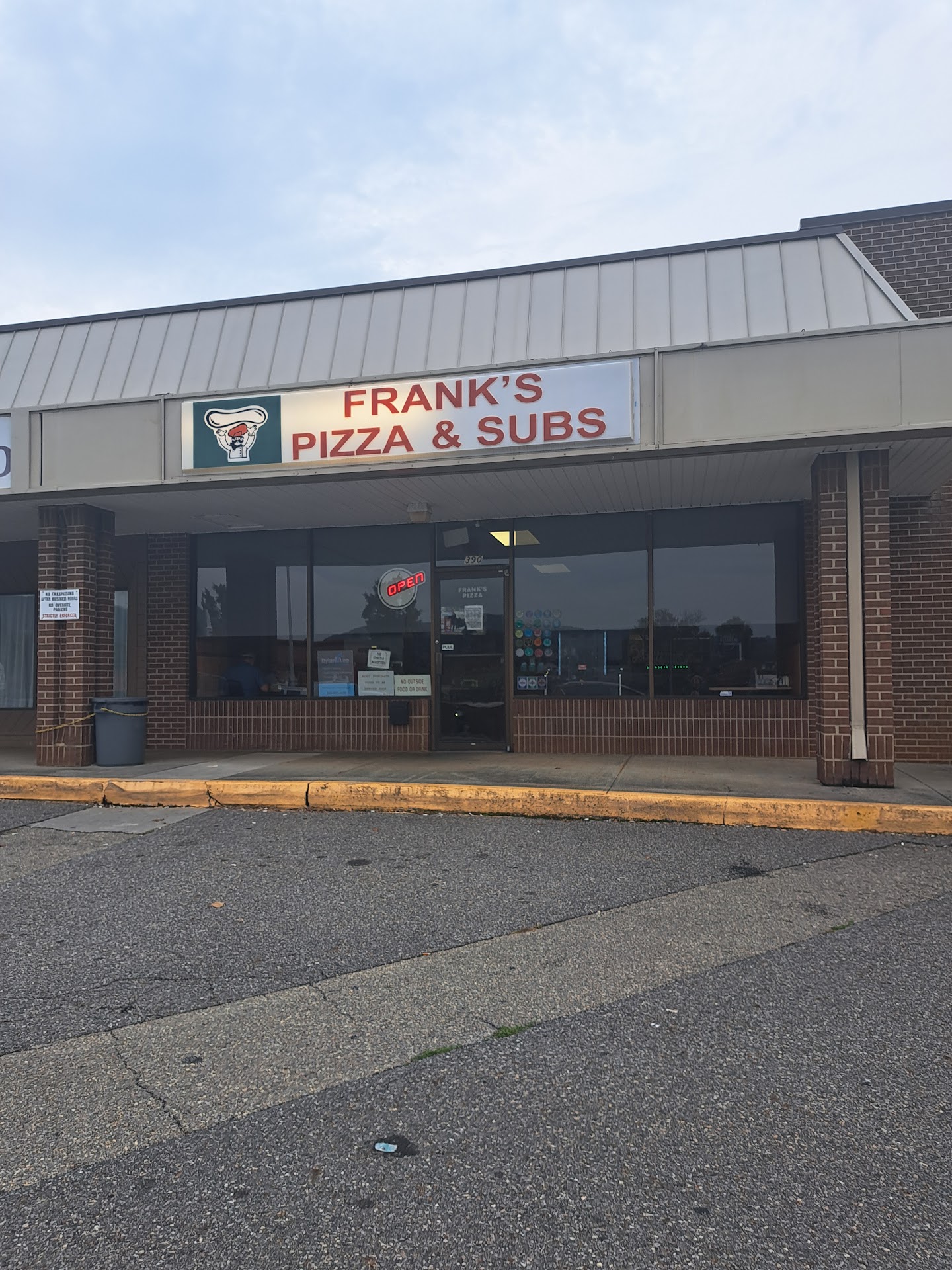 Read moreFrank's Pizza has been here for around 30 years, and is sort of a fixture around these parts. Their pizza is good (I like just the plain old cheese pizza,) and their subs and lasagna are pretty good. I have family from up north, and it's a tradition to get a couple of pizzas when they roll in.