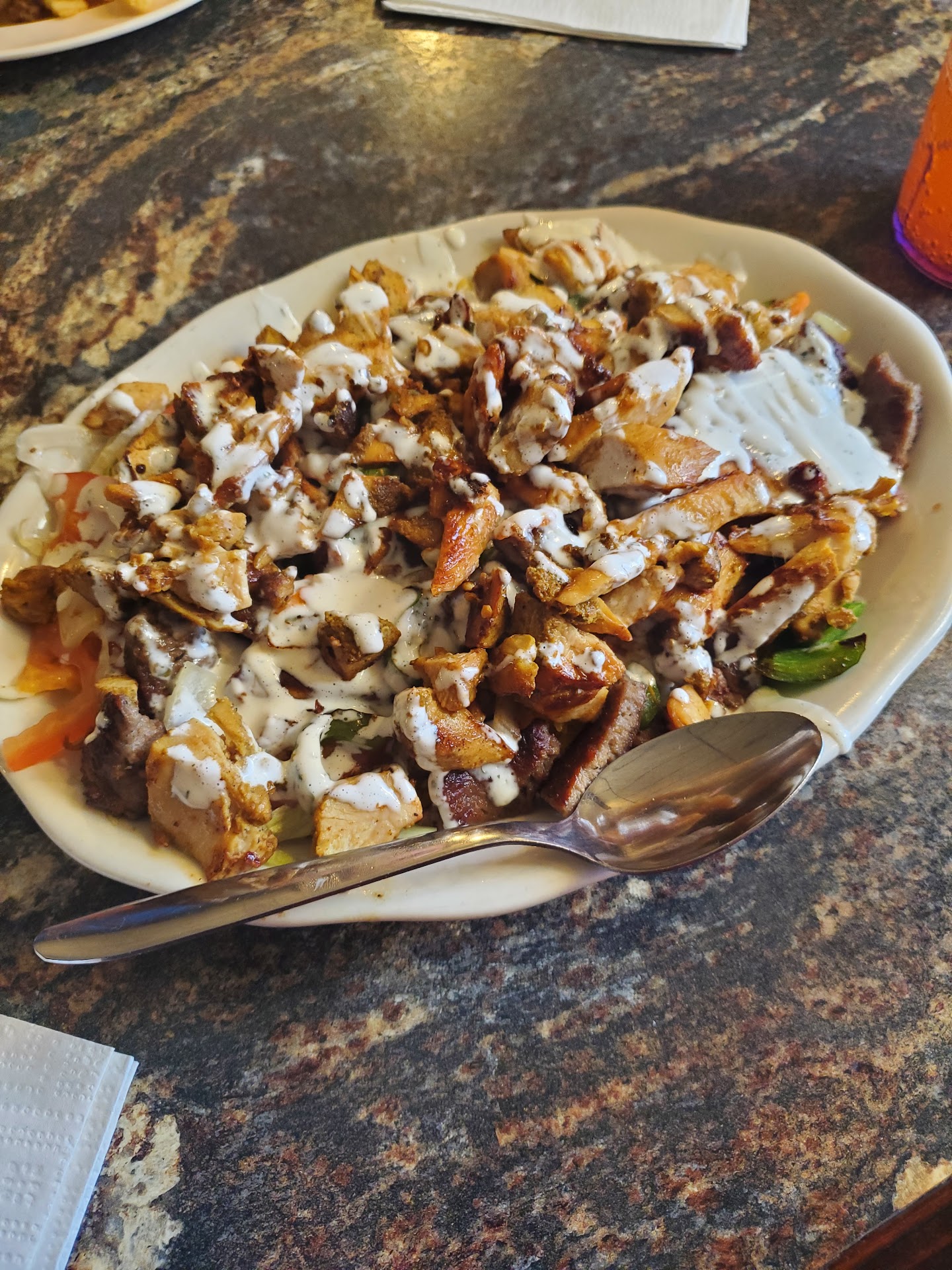 Me and my girlfriend went there aint there for her birthday and the waitresse forgot My order and only brought hers out and the pizza one of the other waitress I asked her where was my order and she got it for me while we waited for waited for at least 3 hours for our food to come My girlfriend came out but mine didn't mind it shall eventually the other waitress who was obviously waiting our table toour table too and every other table in there and there got my order where the other waitress was I do not know the place was chaotic they up charge you 15% of your total bill and and explain it on the economy When we finally ordered our food lamb chicken and rice special we barely got any rice and the chicken porsches and lamb horses were very small the food was good but it wasn't what we expected and the service was horrible except for one Waitress a very skinny brunette who did an amazing job Overall this place used to be really good I would not go...