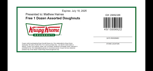 Read moreI only stopped by because they was offering me my birthday glazed dozen for free. I had a coupon for $7.99 I was going to do on a separate order for my aunt. There customer service has really gotten bad. One there were several employees there. The had hot donuts coming off belt line no one was watching them so they all started to pile up. So everyone was running around trying to grab boxes and trays to get them. I ordered the two dozen and they gave me the cold hard donuts they would not give me the fresh donuts coming off the line. Then for the coupon I printed it out that's what the email said I could do. But Ki ki the person waiting on me the supervisor was saying no we can't take that. You must have the email pulled up on your phone to scan. She was very rude and she looked very irritated to be there. Am pretty much done with this location. There quality of service and there quality of food that they offer to you. When you travel just to get there products it's just...