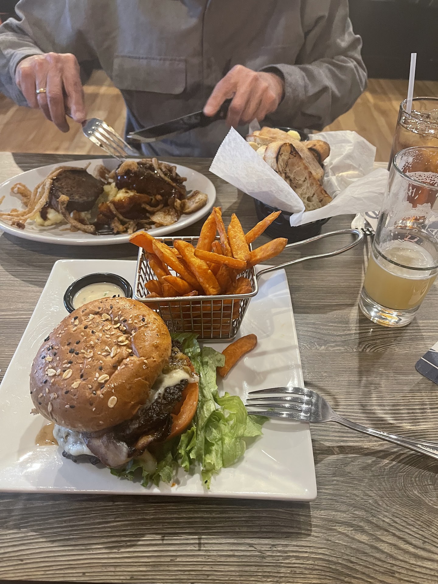 The Smoked Turkey Burger consisted of a turkey patty, spinach, pickled onions, and tomato on a toasted sesame bun served with sweet potato fries and cranberry ketchup. The turkey patty was salty and garlicky.