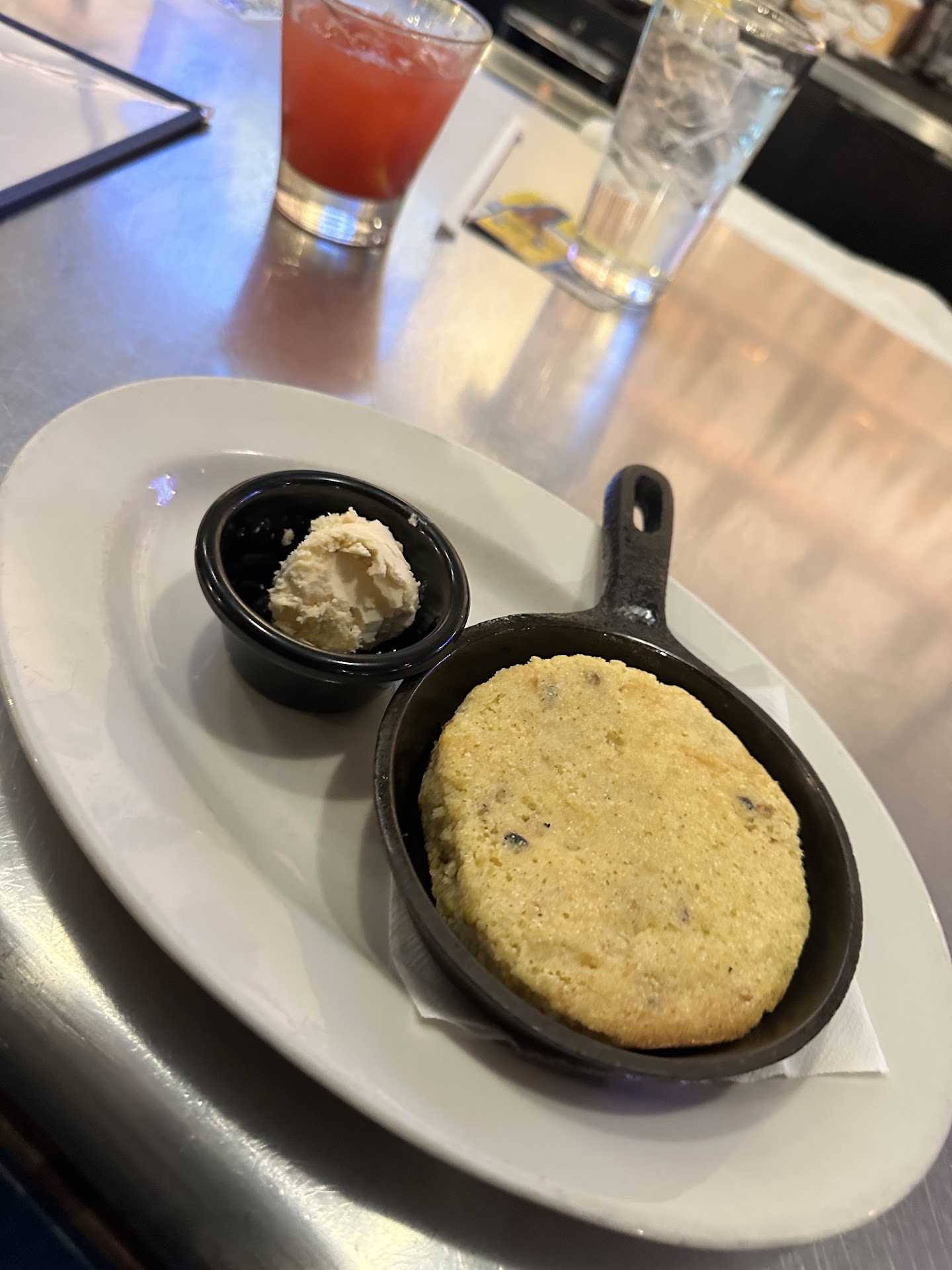 For starters, we ordered Skillet Cornbread, which was served with butter balls but we waited an hour for it and it came after we finished dinner.