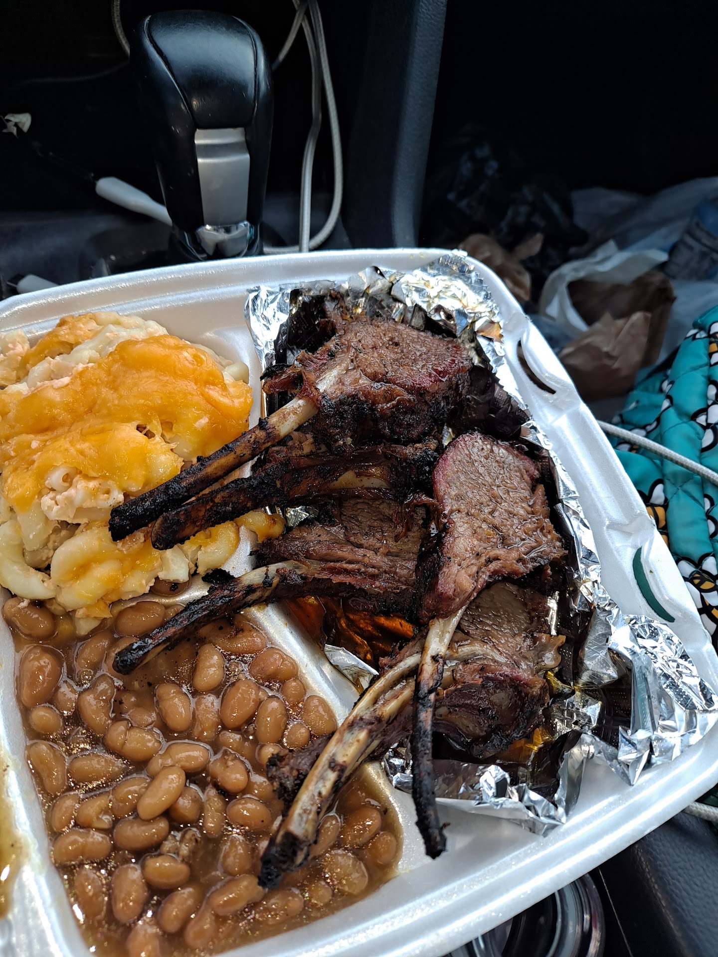 The extra six-minute drive was worth it. We arrived at a food truck with no seating, so we ate in the car. We ordered the sliders, pork chop, and baby back ribs. Every bite was a treat—the meats were incredibly tender, falling off the bone (especially the chops and ribs). The mac and cheese tasted homemade and was solid, and the baked beans were sweet and flavorful. The only thing that didn't hit the mark was the lemonade, which tasted like an overly sweet mix.