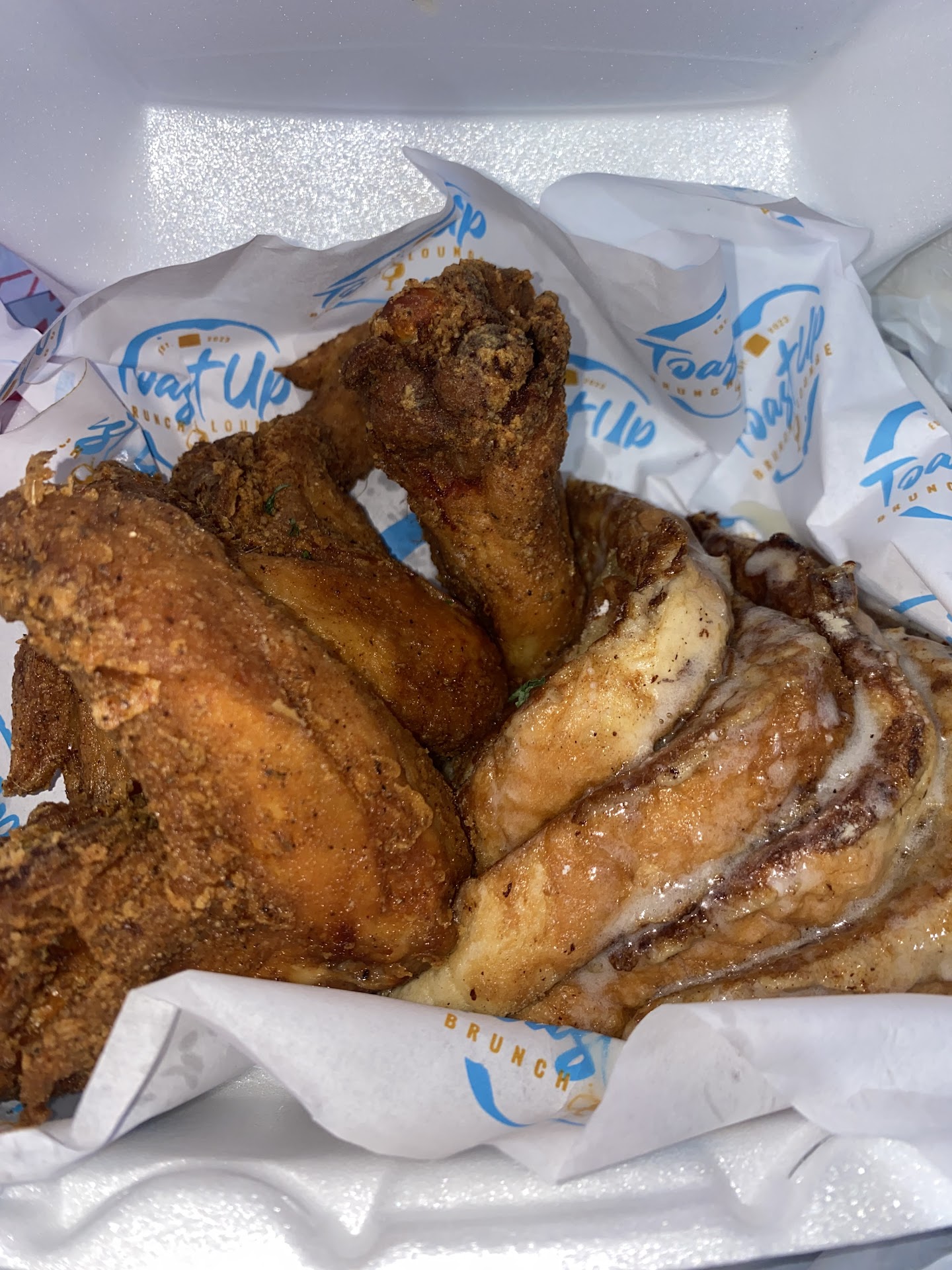 Read moreFirst time trying them & last.First off service seemed to be ok at first. once we got our food then we noticed problems. Asked for 2 wings and waffles and an additional side of french toast & a salmon cake meal. Food came just the chicken & french toast. No waffle asked the waiter oh I got you down for this (whatever). salmon cake meal suppose to came with tartar sauce,it didn't. My girl asked for it. The waiter went to get & we were waiting 5 min or so went by she behind the counter, hugging two guys talking. She finally looked over at my girl, came over & my girl said I'm still waiting for the tartar sauce. She said oh ran back & got it. Chicken was good. french toast didn't have any taste at all avoid at all cost. Salmon cake was ok at best. Time to pay asked for a Togo tea. My girl asked for just a cup to put the rest of her lemonade in the waiter, bringing us both back togo waters. She might've done a better job if she didn't have an airpod in one ear. How can you take orders with an airpod in one ear, a tv playing and music, and trying to hear the customer order. Top everything off it's a 18% tip already in the bill. For What ok at best food & sorry service. Sorry to say I was expecting better especially if you have 18% gratuity already included. This was the service with 10 customer hate to see a full house service &...