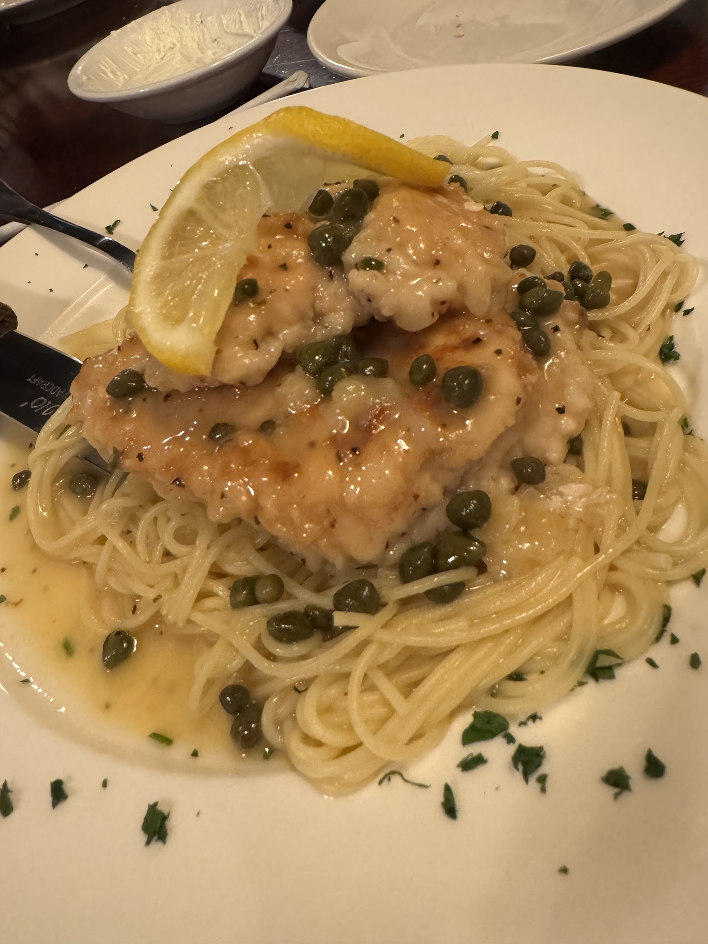 Food: I usually get eggplant parmesan or lasagna. During this visit, I went with the Fettuccine Alfredo with added chicken and broccoli. Holy moly Batman...Delicious!! My friends got the lasagna and eggplant parm. They both loved it!! All of us took at least half home as they served generous portions and just as generous basket of bread and butter. Our meals came with salad and your choice of all homemade dressings. I always get a bottle of their house wine. It's a nice red blend that everyone always seems to like.