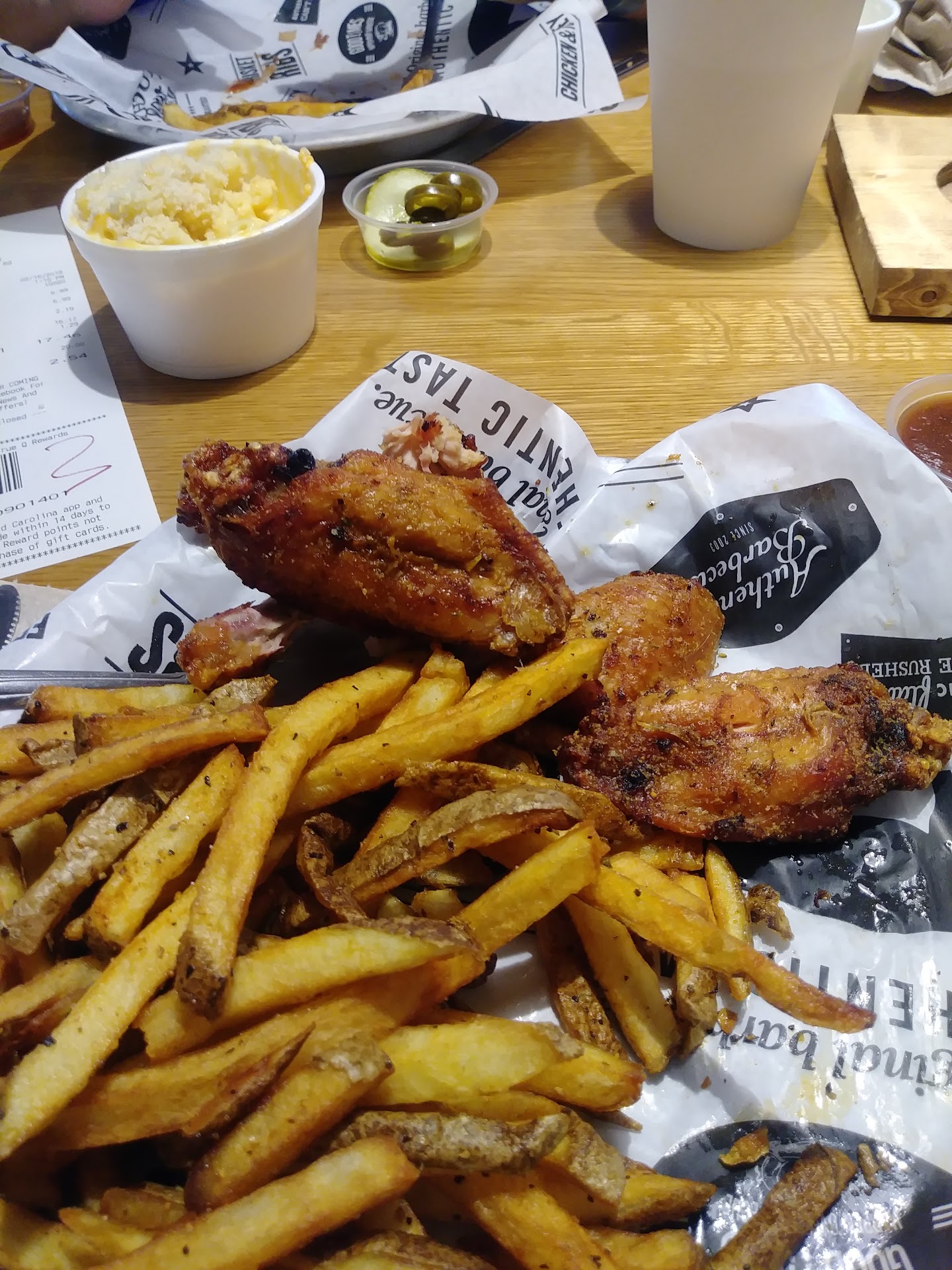 Service: Did carry out and didn't get one of the sides. Also, the order payment was messed up - was supposed to pay in store but an employee had mistakenly charged another customer for our order. No one initially knew what was wrong and it took time for them to realize the issue. Turns out someone accidentially paid for our order, but we kept being told we didn't owe anything by both the cashier and manager. Being honest we said we didn't pay and still owed our bill. We waited quite a while to pay, then when we finally did we were not thanked for being honest and paying our bill.