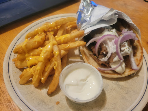 My gyro was ok. The pita was a bit on the small side, and the meat was a little extra toasty which is to be expected if it's a dead evening. They really loaded it up with meat, almost enough for two sandwiches, and the onions and tomatoes were fresh looking, but they forgot the tzatziki sauce! A genuine tragedy, as a good sauce can make or break a gyro. Other reviews mention the sauce so I assume it was just an honest mistake by a person still...