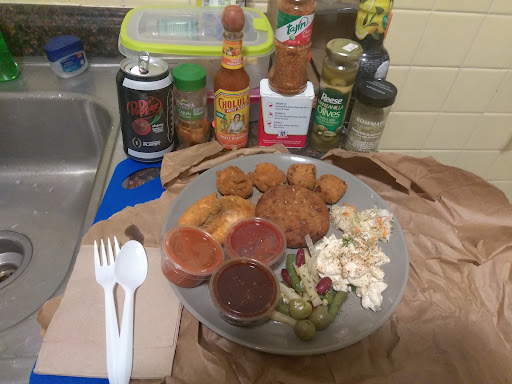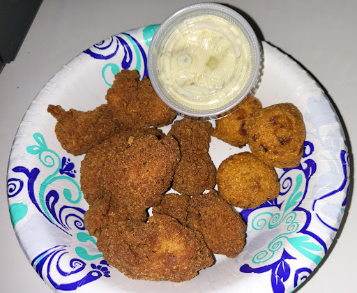 This is a take out spot. Seafood options, plain or breaded, sold by the pound and can be fried on the spot. Side items and Dips are available for additional prices. Not sure what all the options are.