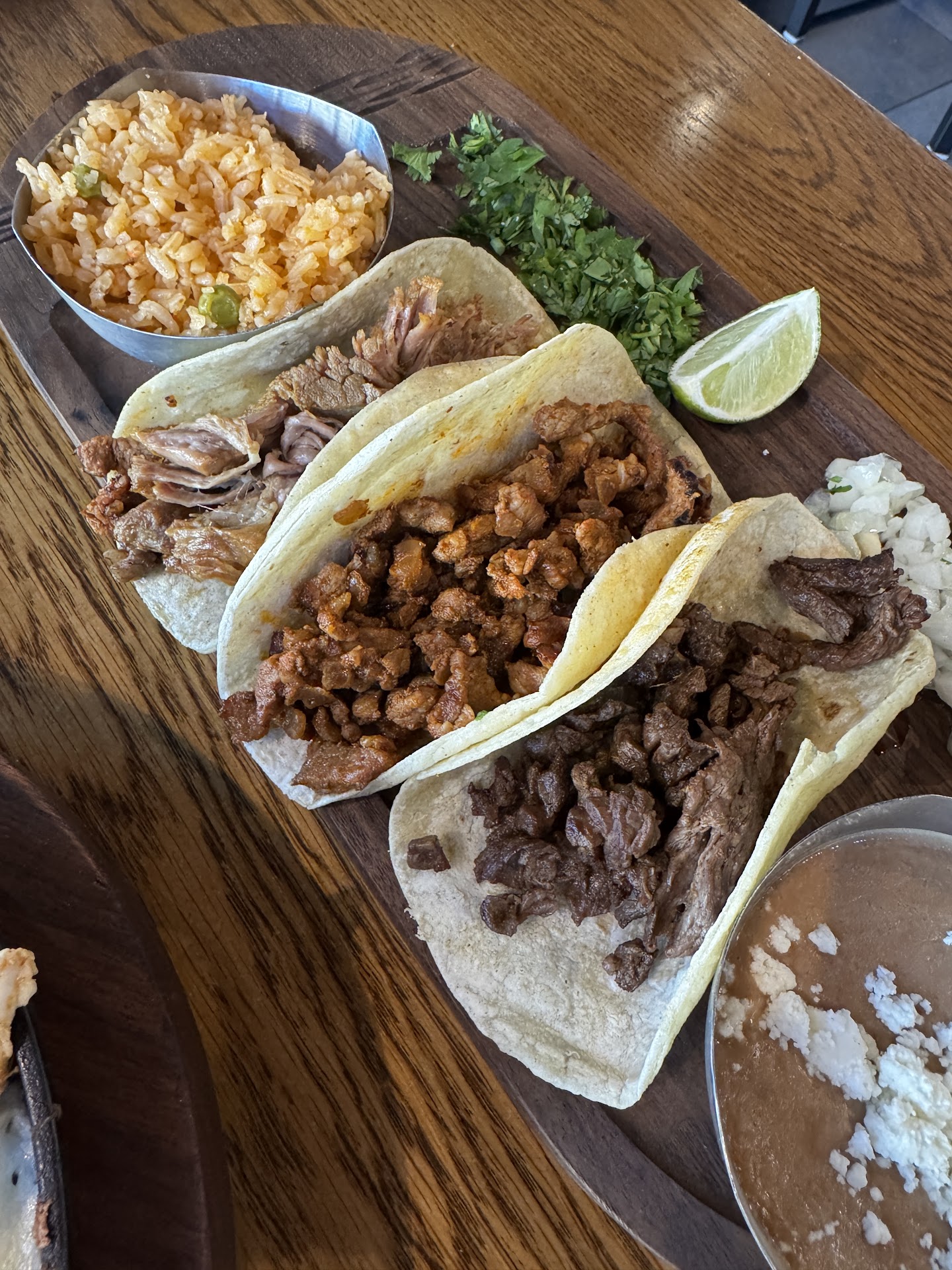 Upon entering, we were greeted nicely by a younger gentleman who sat us down in the front section of the restaurant quickly and efficiently. The ambience was nice, and we were given free warmed tortilla chips and salsa, (which tasted like pure Clamato), which were flimsy and then proceeded to wait 10 min for water (there was only two other tables..) We ordered the skillet nachos with chicken and three tacos with rice and beans--disappointing! The skillet nachos were only warm for 5 minutes, and the cheese was solid hard the moment it was served to us. The chicken was alright, and the guac could have more seasoning and texture. The chips were stuck to the solid cheese, and those that weren't were flimsier and thinner than paper. The tacos were so bad. The al pastor tasted like chorizo gone bad, and the carne asada was dry and thin. The onlv taco that was semi decent was the carnitas-- as it wasn't dry. The tacos didn't even come with any salsa, and you pretty much have to assemble it on your own. The rice was super salty, and you can taste the chicken bouillon in it. The beans had a foul aftertaste of something almost coffee like, which is very odd for beans. Upon paying we were asked if we wanted any to go boxes, and initially we said no, and decided to take them home and not waste by feeding to our chickens. The waiter was initially alright with our requests during our experience, (and we were very respectful), but upon changing our minds for the to go box, he was very rude, didn't respond, and walked off as he rolled his eyes. (He had a dragon ball z belt, so watch out!!) we were not even needy of any requests, and only asked for water once and a side of salsa (a different server fulfilled both of these requests...).