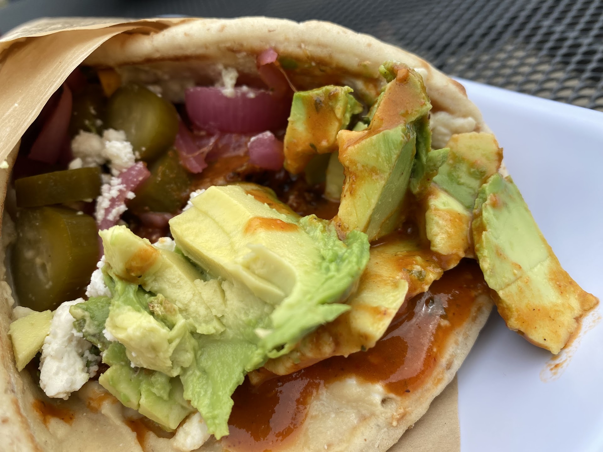 The food was lack luster. The only seasoning were in the sauces. I ordered the steak and feta and it was a solid 6:10. I ordered a side order of hummus and falafel, and my friendordered the roasted eggplant. We've both eaten at a number of Mediterranean restaurants and even middle Eastern. So we're both familiar with what the assorted dishes should and have tasted like. The falafel didn't taste like anything. I mean that literally. My friend and I noted that the chickpeas that made up the falafel and hummus didn't have any flavor. It was wet mush or crunchy mush. Not to be mean but oatmeal has more flavor plain. There was no salt, no lemon juice, no garlic. Honestly, it didn't even taste like any of the listed were even present in thr kitchen. And at $35 per person or just wasn't worth it.