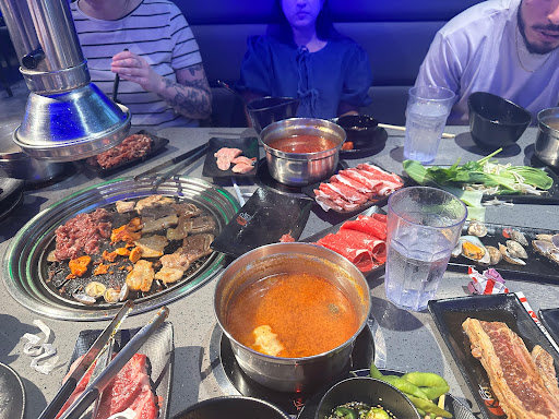 We absolutely loved the food! There was a learning curve for sure but our waiter was very kind and showed us how. I recognize this is a new business so I always think itâs important to note room for improvement. We came in with two adults, a 1 year old, and an infant in an infant carrier. The hostess recommended seating us at a 4top instead of a 2top to have more space with the kids. We were seated at the 4 top next to the service station (where wait staff collects their supplies). We got a high chair for our toddler and put our baby in the booth seat next to one of us. Between the edge of our table, the high chair, and the service station right behind our toddler we were cramped for space. The line for the sauce bar often ran through there when a line collected so it was such a high traffic area it was uncomfortable at times. Having the line right behind our toddler, and then when wait staff had to grab from the cabinet there was just a lot of moving and squeezing for those walking by and I couldnât help feeling like we were an inconvenience to those around us. The servers also came through there with the carts full of items to bring to tables, and often ran hard into the high chair. The high chair being at the end of the table also allowed our son to find out about the knob that turns the BBQ on and off and it was difficult to get him to stop messing with it. The hot pot tops on the end were within his reach so we moved the hotpotâs towards the inside seats to stay safe. The server who brought our meats and veggies was very young and kept just placing all of the raw meat directly in front of our son as if he was serving it to him which was hard for my son to understand that the food wasnât ready to eat since it was literally placed in front of him.