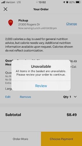 Keep in mind weâve now been there 25+ minutes. They made me wait OVER 20 minutes to get our food remade. We had originally ordered a bacon quarter pounder with cheese meal (large) and a chicken nugget meal (large). Our food finally comes out. Whew. I sit down and we rush to eat as it had not been our plan to be at McDs for an hour.
