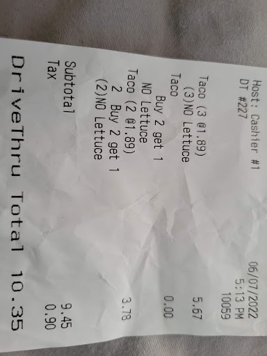 Read moreLet me start by saying Taco Casa is my favorite fast food, period. It started in my home town and I have eaten there most of my life. I live up north now and we do not have any Taco Casa locations within several hours of our home. So, anytime I am in a location that has a Taco Casa, that is usually my first stop. I have eaten at this location a couple of times over the last couple of years as I visit the area. The food has always been great along with the service until or most recent visit. We stopped there on Tuesday evening at 730 pm. We sat in a line 6 cars deep from the ordering screen. We waited in line for 20 minutes and only 2 cars actually made it to the screen before we left. We saw 2 other cars leave while we waited. I could also see inside the building and multiple people were standing with drinks but waiting for their food. So, we visited today at 4pm. There weren't many cars in line the service was extremely slow again. We waited this time only to receive food that was thrown together and tea that wasn't sweet. You couldn't pick up a burrito without the filling falling out of both ends. Needless to say, my family was disappointed in this Taco Casa location. With the amount of business we saw leave, one could hire better/more help to provide the community with good food and...