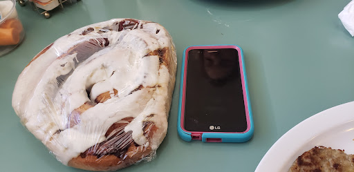 Stopped to get some gas and found this little gem . Looked like it had been there forever . We were there at 2ish and there were several cars . As we sat down .. they brought us water and the menu. The menu had breakfast , lunch and dinner.... and you can have it all. It was a huge menu with a variety of items. My husband ordered a sausage and egg breakfast... he loves breakfast anytime. I was suggested pot roast... it was HUGE! The pot roast came with mashed Potatoes underneath . Great comfort food.. i told them I had to have the cinnamon roll for a to go ...it was 2lbs and probably 1/4 of a baking pan ! It was a little gooey in the middle because the dough was not quite baked in the center , but I reheated 1/2 of it and it baked the center part, delicious! She suggested i make French toast with it... and I had enough left over to make 2 big slices ...amazing! Everything was homemade...she gave me a biscuit with my pot roast, plus a roll which she said looked bad... both were so good . I just couldn't eat it all. But took it home. I wish we lived closer...it was a place that if I wanted comfort food , i highly recommend you stop...
