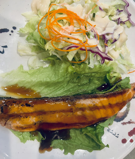 We each had a cold Japanese beer served in a perfectly chilled mug—refreshing and a great pairing with our food. I had the salmon teriyaki dinner, which came with miso soup, salad, and rice. Everything was satisfying and just right.