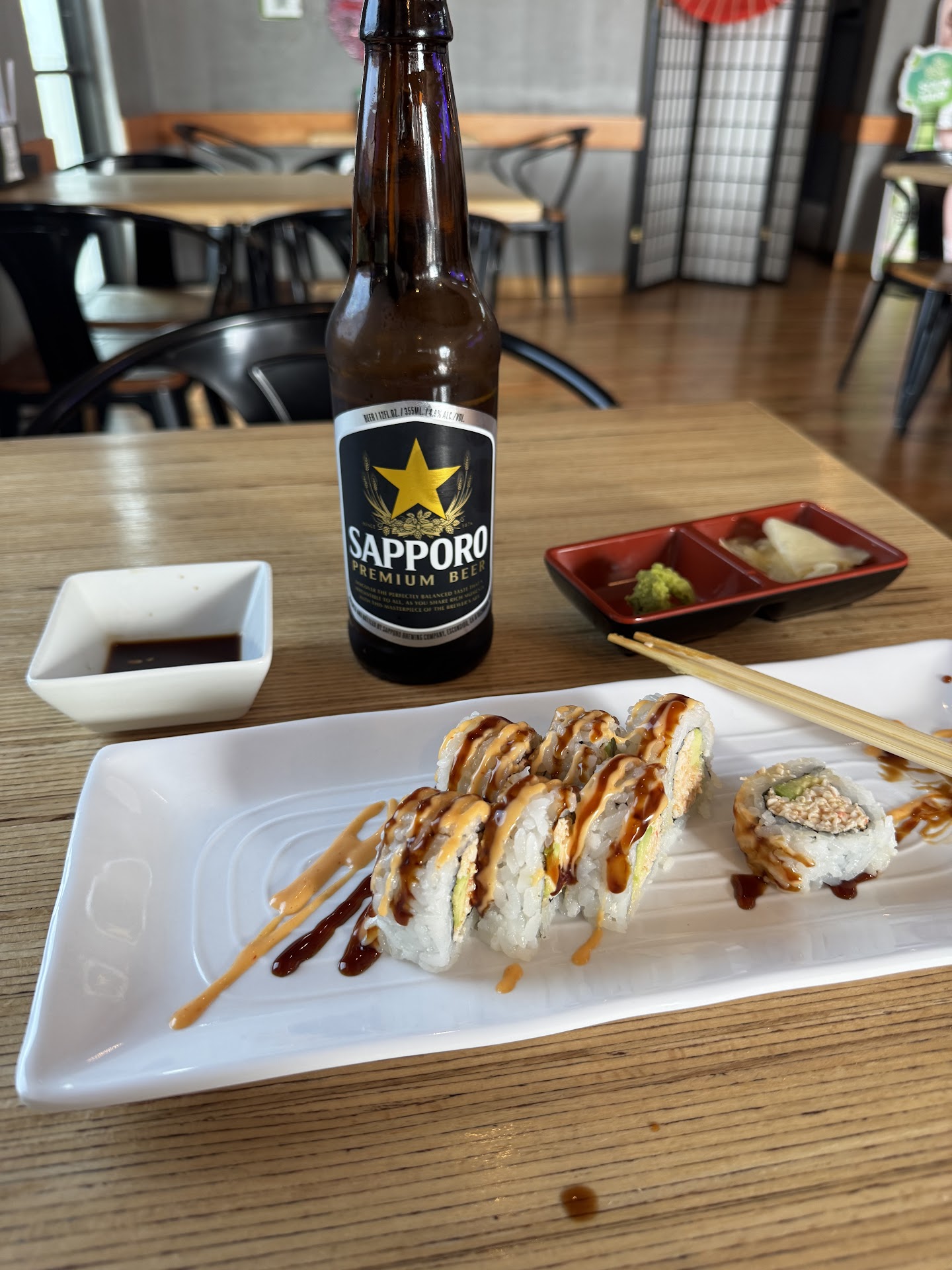 Today was a quick lunch, so I went with the California spicy roll, and a Sapporo beer to wash it down.