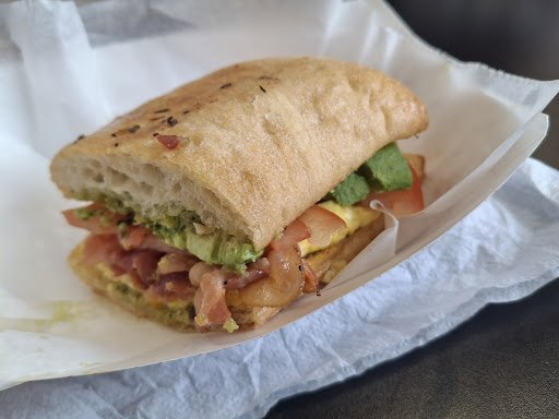 Candied bacon, avocado, basil pesto sauce, cheese, tomato and egg on a flawlessly toasted ciabatta roll which retained a soft interior with a mildly crisp exterior makes for what my nephew exclaimed is,"The best breakfast sandwich I've ever tasted." I was surprised even more that the kiddo was into the Basil Pesto.