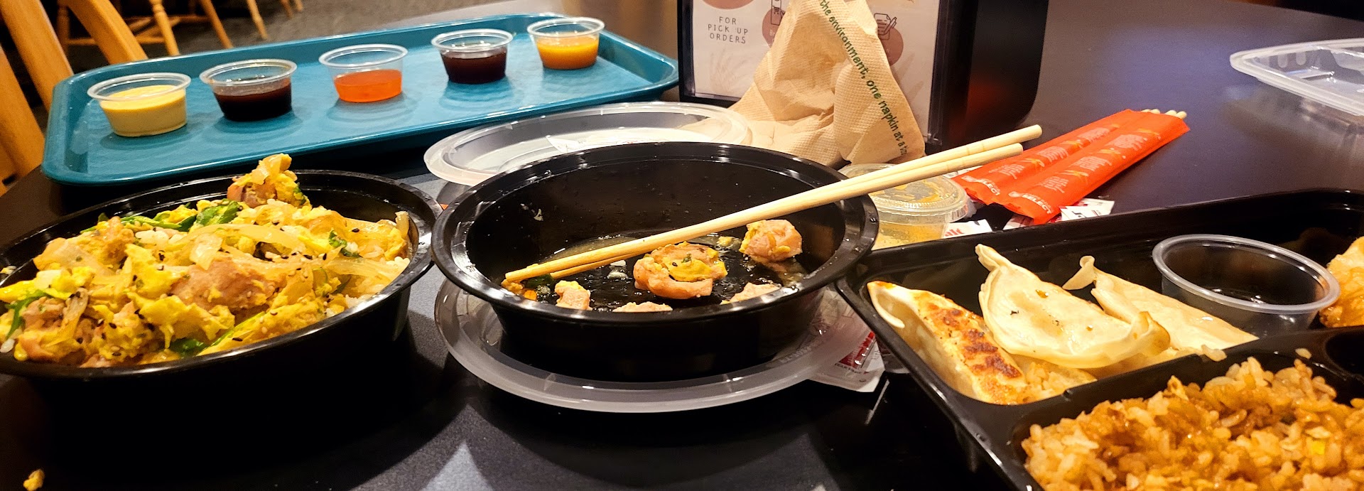 Portion sizes are generous, with plenty of food included to sate most hungry patrons. The entire establishment appears to offer environmentally friendly food packaging and utensils. Water is provided free of charge from a water station with whole lemon slices in the water for flavoring.