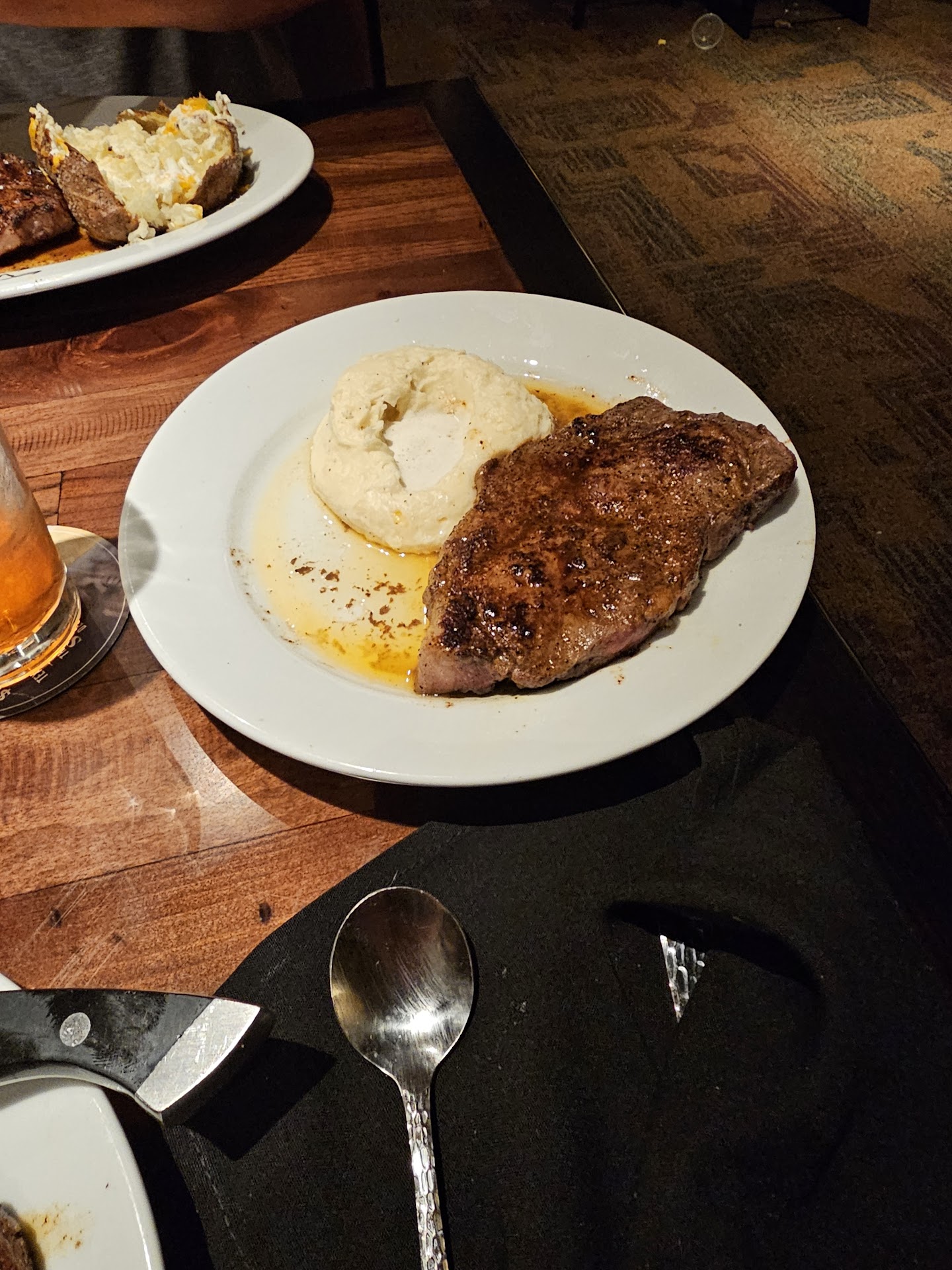 Ribeye cooked to perfection, fire roasted corn was đ„ and stuffed baked potato was cooked just right.