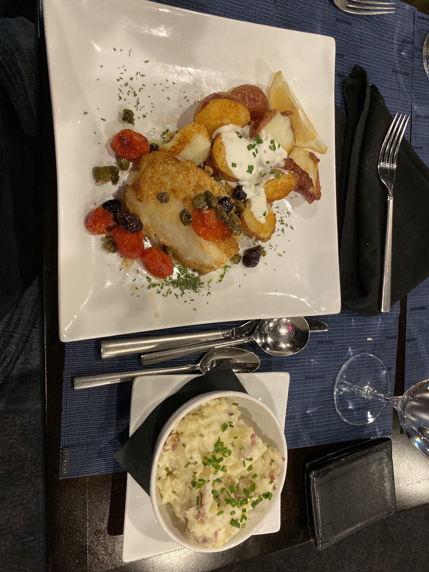 This intimate setting is great date night option with a wide selection of delicious food and drinks... The crab dip was very good and I love crab, so for this area it was a decent crab dip option... Also the bread pieces had a sweet seasoning that added to the flavors...The romaine wedge ceasar salad, which is topped with their very own house Ceasar dressing was very good... I decided to try the Y3 California north coast Cabernet per the suggestion of my waitress and it ended up being a surprisingly great choice, this dry red wine is very rich with flavors, I will definitely try again... Both the mahi and the pasta were delicious however I have to say I prefered the mahi mahi...the goat cheese potatoes were soooo delicious, I have never really eaten goat cheese but it added a creamy aspect to the potatoes which I thoroughly enjoyed....maybe I didn't pay close attention to the menu description however with the shrimp carbonara, I was under the impression that it was topped with a red sauce, turned out to a cream sauce but it was still good....overall thoroughly enjoyed my experience however the portions are smaller than I expected but the quality of the food and drinks is worth the visit!