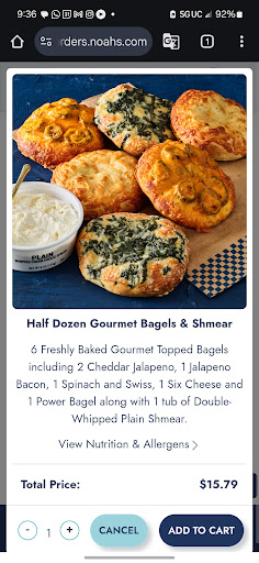 I ordered the gourmet half dozen bagel with shmear for pick up. Got home and saw there was no shmear and the bagels were not the ones that says it's included on the ordering site. They even included a roll that's not even a bagel. Went back and they insisted that it is just whatever gourmet bagels they have and you need to call to ask for specific ones. This is ridiculous because it states "Half Dozen Gourmet Bagels & Shmear 6 Freshly Baked Gourmet Topped Bagels including 2 Cheddar Jalapeno, 1 Jalapeno Bacon, 1 Spinach and Swiss, 1 Six Cheese and 1 Power Bagel along with 1 tub of Double-Whipped Plain Shmear." There is no way to edit the bagel selection and no Disclaimer that says it includes a random selection and you have to call. I'm pretty sure they were just lying because they're busy. I'm very disappointed as I do order Noah's on a...