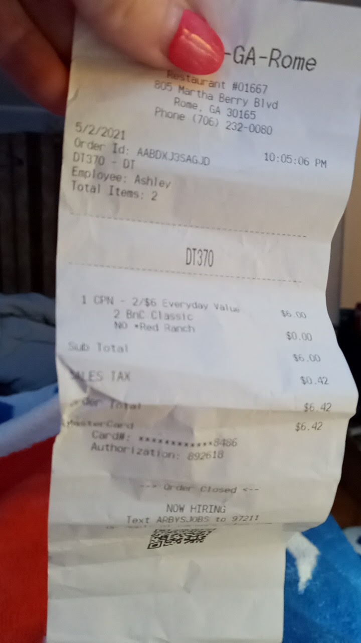 Read moreThe worst Arby's ever. Visited on 5-2-2021 around 10:00 pm. Ordered 2 beef and cheddar with no red ranch and had to return to store because the red ranch was on my sandwiches. We also asked for 2 cups of ice and the guy at drive thru told us they had no ice. When we returned the 2nd time we were in line and seen another employee dump buckets of ice in machine. When we got to window to get our order fixed we asked for 2 cups of ice and he gave us a very small amount and we had to ask the manager for more ice. There was no reason for the guy in drive thru to treat us this way and I stated that I would pay for the cups of Ice. If he was working for my company and treated my customers with that kind of dis respect, he wouldn't have a job. I gave 1 star because 0 stars...