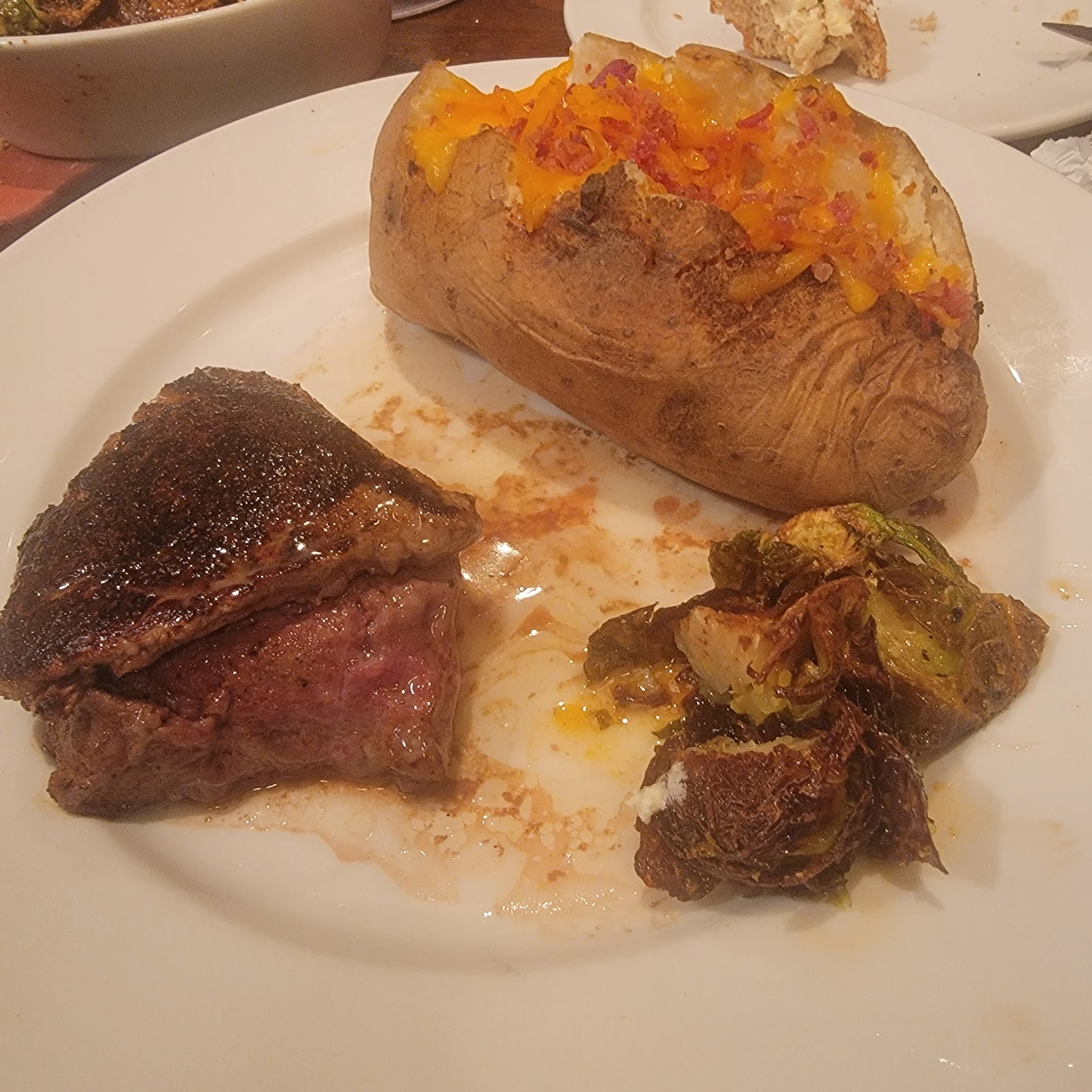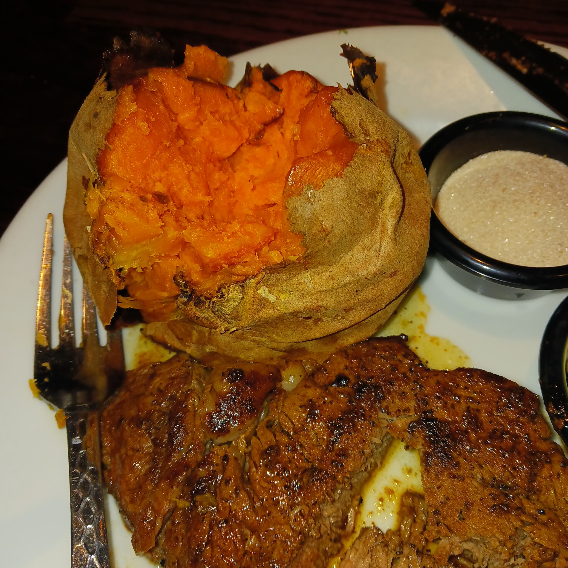 The food was just okay. My ribs were tender, but my wife’s steak was supposed to be medium well and came out well done. When the server finally asked how things were, my wife mentioned the steak, and the response was, it is hard to get it medium well. At this point why ask what we want or just stay home and cook our own i guess. She did offer to replace it, but by that time we were ready to leave. She said she’d discount the steak—but that never happened either.