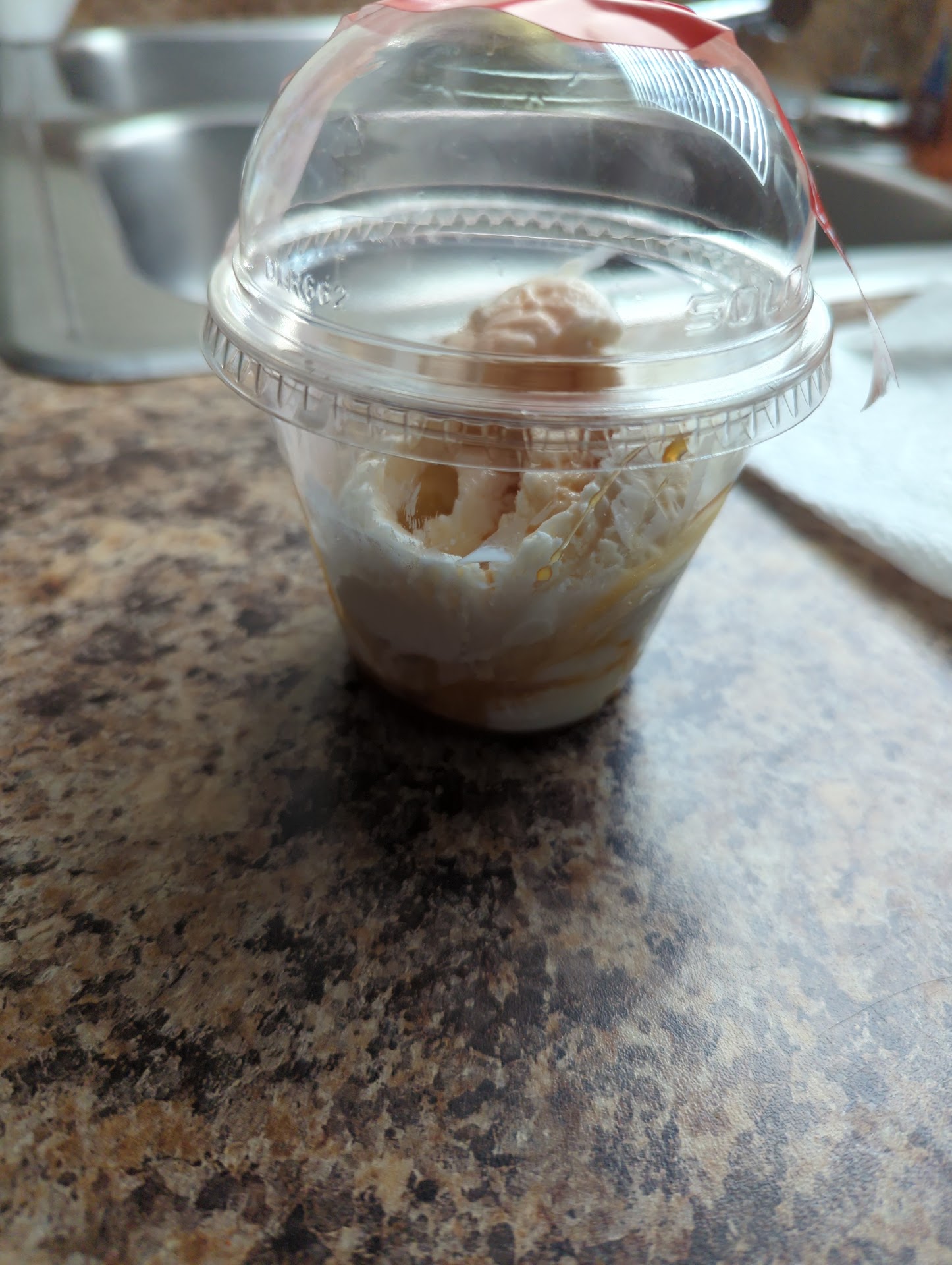 I ordered a single scoop waffle cone and a milkshake. I was told when my milkshake was made that the lid didn't fit and is just sitting on the cup. The worker apologized and said they had ordered the wrong size, but were still trying to use the lids. My milkshake was topped with whipped cream and a cherry and within my 3 minute walk back to work, the cream was dripping in rivulets down my arm, and this is with 2 napkins wrapped around it for protection! I was so busy wiping off the cup drainage that my icecream then started leaking out holes in the waffle cone and down out the bottom of the cone.
