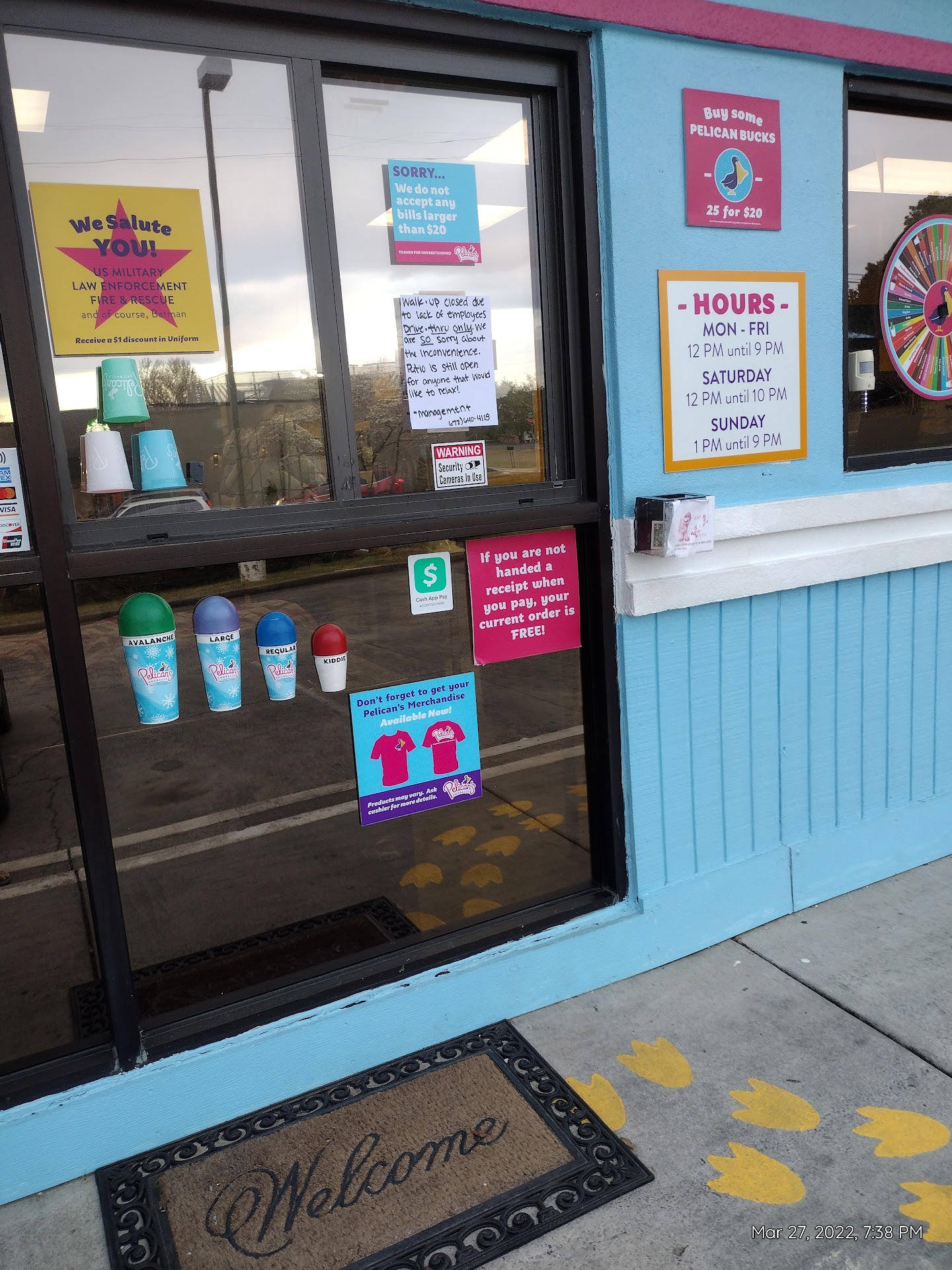 Read moreThe snoballs are delicious!! The only reason they didnt receive 5 stars is because the wait time is still a little long which is understandable but no one says anything. At the walk up window they would take the order in front of you and shut the window when you walk up. I have managed many of shifts with children so I understand training them. They need to know to at least say I will be with you in just a moment. Also I called to see what time they were closing and the young lady answered but simply said hello. You should always introduce your facility. Granted she was a sweet and polite young lady. These are NOT major issues but could turn a seriously picky person off. Keep up the good work. I will be back to try many...