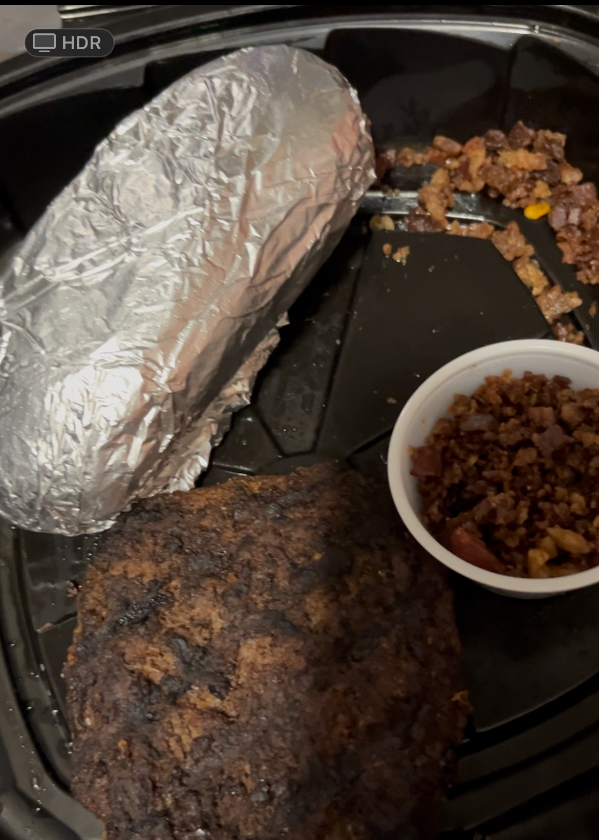My husband ordered a single pork chop with cream gravy, a baked potato and a house salad. My order was beef tips with rice, onions and mushrooms and brown gravy along with a house salad. In the to go menu, it clearly states brown gravy is included. She said, she would have to check on the brown gravy because it is not included and put my husband on hold, came back and asked would I like a bowl of brown gravy because it is not included in the meal itself. The answer was yes.