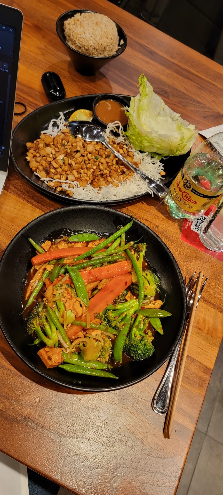 Our server showed up shortly thereafter with our drinks in hand and took our dinner order: Mongolian Beef, Pork Dumplings, and Chicken Lo Mein…didn’t write it down. Now we’re worried. Food came out really quickly, but the runner only had two of the three dishes we ordered, so we let her know what we were missing. After another ten minutes, my daughter and I start eating because we don’t want to compound the problem by letting our food get cold. We see our server at the p.o.s. checking to see if she had in fact rang it in (pretty sure she did as it was listed before the other two items on our check). Instead of coming over and at least acknowledging the problem, she tells somebody else that she’s missing my wife’s dish. At this point, our drinks are empty. When the third dish (pork dumplings) is ready, she brings it out, drops it off and does a 180 and walks away without saying a word or offering to refill our drinks.