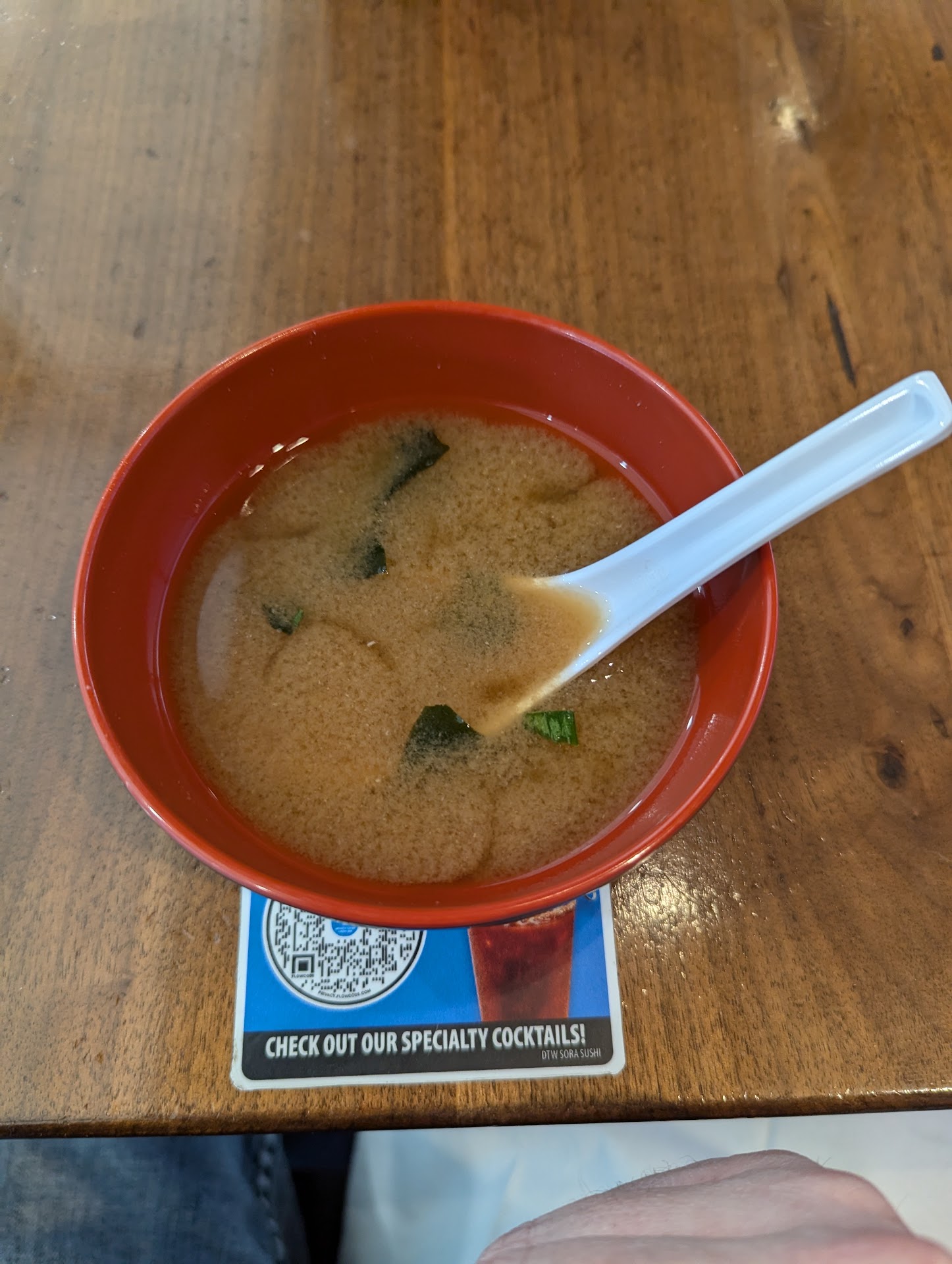 Due to a scheduling quirk on one of my transcontinental trips, I had 2 hours to kill in DTW Airport, so I was looking for a leisurely-paced meal. I did not communicate this expectation unfortunately, and as I was sitting at the sushi bar, they brought me both my gyoza and soup at the same time. I would argue they should have asked about coursing before plopping down two hot plates in front of me, but I was willing to forgive and forget on account of it being an airport restaurant, and the expectation of most people being to get in and out as quickly as possible. I tell my waitress that Iâm not in a rush and ask to slow down the pacing.
