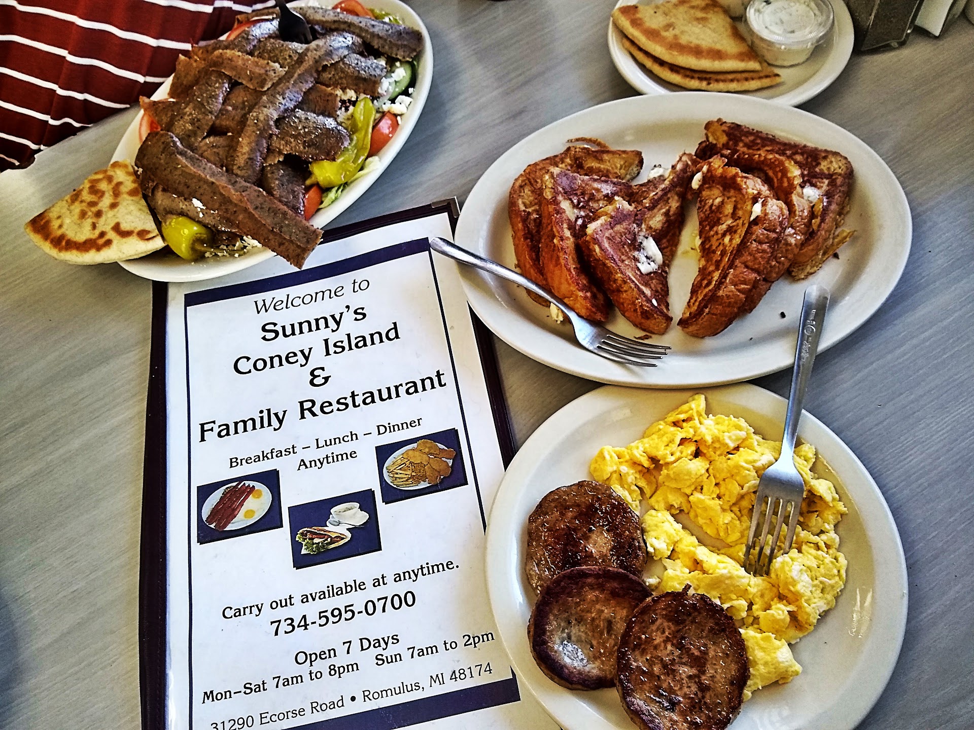 This Ma n Pa place been around about 30 year's packing the hungry families in. They use to have Ray's in Lincoln Park now in Romulus great location Ecorse at Merriman. Lot's of airport employees be regulars. Beautiful dining area spotless clean, fast friendly service always. We started with Ham n Beans Soup Delicious. Becca French Toast Eggs n Sausage Patties yummy. Me a special request a BIGMAN Omelette Gyro Feta Onions inside and a order of Gyro Meat sliced of the spit. Absolutely fantastic nope couldn't finish it all. Big Bowl O Grits Love. Hey they looking really hard for a few waitress, great money great owners. Stop in or tell someone looking for work with experience. #sunnysconeyisland @sunnysconey #needwaitress #gyrosalad #greekomelette #grits #diner #downriverfriendseat #downriverclassic