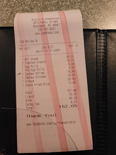 I spent so much money on this meal that I am very disappointed to report that it was the worst Chinese food I've ever had at a restaurant. I unfortunately have a feeling we may be on our way to very upset stomachs. Joe Chan's has been on my list to try for a while. I saw the mixed reviews, but overall (somehow) it was higher than the others in Muskegon.
