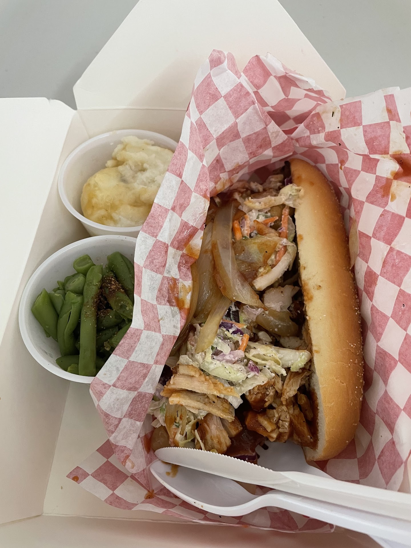 Plain and simple this "BBQ" joint needs to learn how to make good BBQ. Firstly, they don't make brisket or ribs, which were I'm from are STAPLES of good BBQ cooking, but they made pulled pork and chicken so we gave it a try. I've eaten more than my share of pulled pork over the years and this was easily the lowest quality(high fat content) and least flavorful(only flavor was the sweet sauce over the outside) the chicken tasted like it was cooked the day before and kept on the counter. The cornbread was dense, and not in a good way, I'm glad it wasn't sweet but I wish it had flavor and didn't seem like leftovers. The mashed potatoes are instamash which would be okay if the serving wasn't literally two tablespoons worth. The brownie was okay. I give it one star for drive through service, one star for the speed in which it was prepared, and one star for the nice folks who served us, but if I rated on the food alone it would be a 1-2 star. For someone who ain't from Roseburg it sure made a bad impression on what quality of food is available. Next time I'll swing...