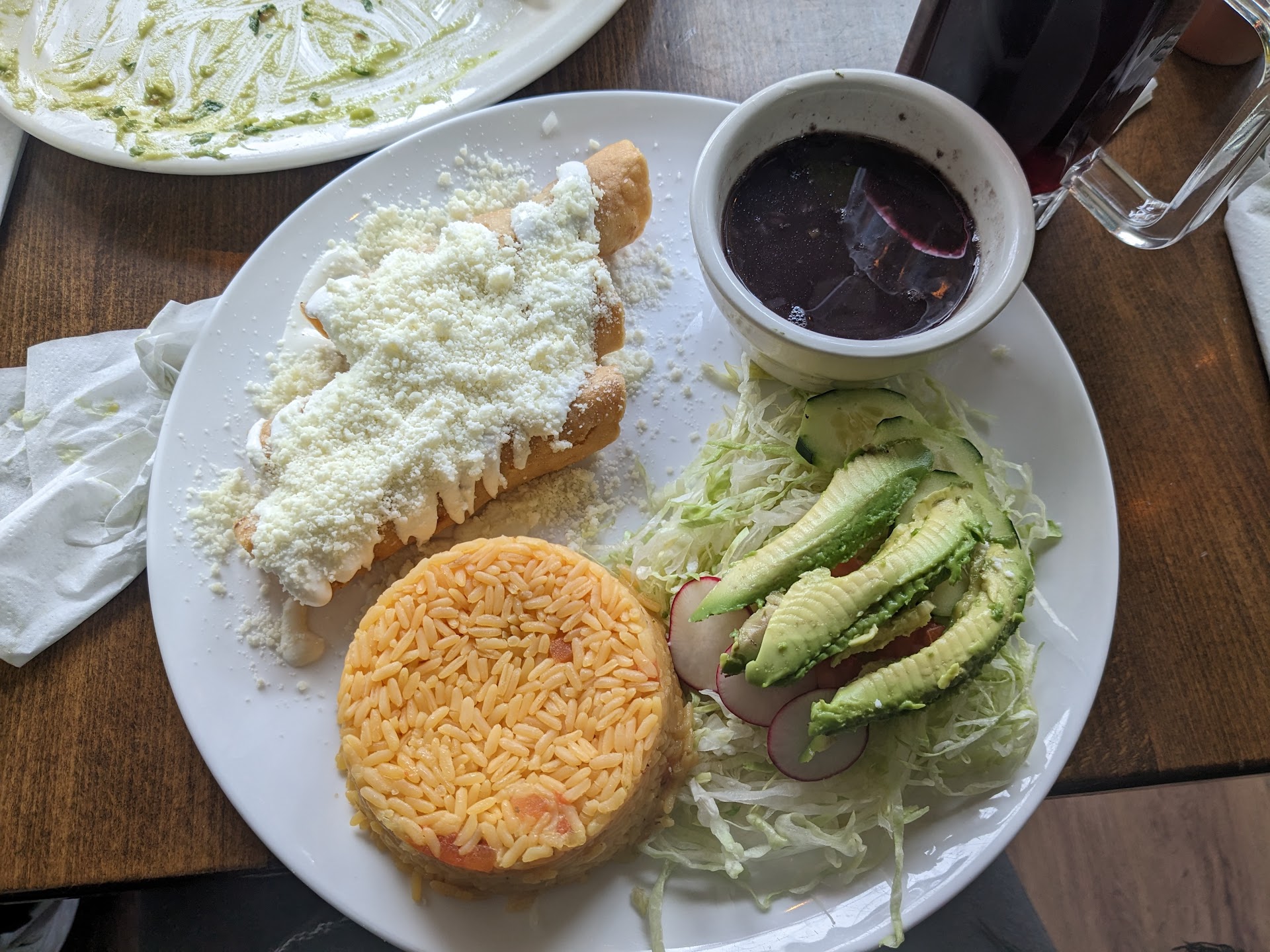 The place offers things to locals which isn't a Mexican staple. For example, you can get a kale green fresh squeezed juice. The windows advertise they are vegan-friendly and offer vegan dishes. This seems to be a business move to capitalize off locals. Not a bad thing, simply an observation. It appears the place has exchanged owners a few times, leading to the revamping of menu items. The cashier/hostess appears to also do the cooking and other labor. This led to a slightly abnormal wait time for food. I don't recommend walking in to pickup....