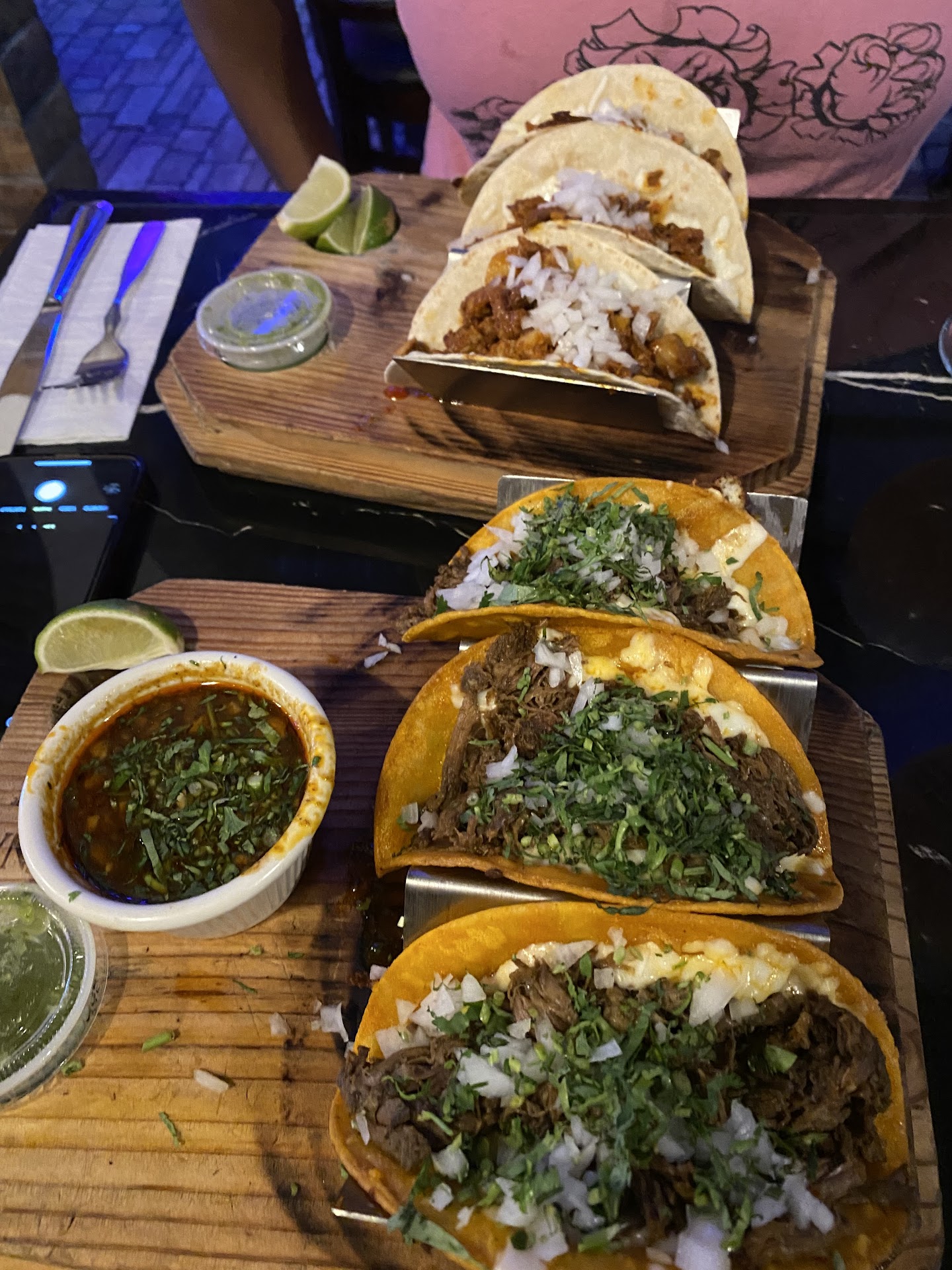Tacos- we got el pastor and birria. Both were delicious and plentiful but $20 each. You get no sides. Nothing.