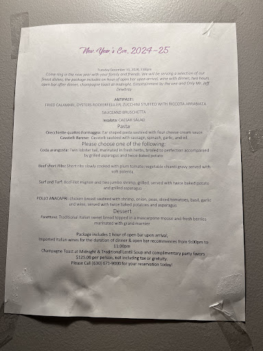 Attended their New Year’s Eve 2024-25 event and had a less than decent experience. The aspect that I didn’t appreciate was that it seemed like they weren’t prepared for their NYE event leading to a sub-par dining experience. Upon our arrival we allegedly had an hour of open bar to which when we ordered, my husband was expected to pay extra for ordering a “Sambuca” because it wasn’t included in the open bar. In other words, it wasn’t an open bar. They should’ve notified what was part of the package in advance. Moving on to food. My husband and I ordered calamari for our antipasti which were literally only 2 fried squid rings per person a little bigger than a quarter, very disappointing. Next was the Caesar Salad which was rather enjoyable, however the portion was extremely small much like the calamari. The pasta came next, the orichiette was enjoyable followed by the cavatelli which was cold, extremely salty, and when we told our server and tried to return it to see if we could instead receive another serving of orichiette she took it back but said couldn’t offer us anything else to replace the dish. Next we got a choice of the Arangosta (“lobster”) which was very mushy, not “broiled to perfection.” We left the potato alone. Another disappointing dish. Last, our dessert was a slice of Panettone with whipped cream which really didn’t have anything wrong with it, however it seemed to be bought vs homemade. After dessert we paid our bill and left. We didn’t stay for “open dinner bar 9:00pm - 11:00pm” or for the “midnight Champagne.” Package was $125.00 PER PERSON tax and tip not included. We left a tip because our server wasn’t at fault and tried to help us out but it seemed management didn’t even try to show any form of hospitality. The “entertainment” turned out to be a man celebrating his wife’s birthday taking pictures with his family and eating most of the time. The only thing he did was make a playlist on his phone and plug it into the restaurant’s sound system. Seemed like this establishment just wanted our money. This was truly a disappointing end to our 2024, we left still hungry, not satisfied, and hope that this restaurant makes a turn for the better in 2025. Their normal menu seems ok, it has good reviews, but last night was not a good experience...