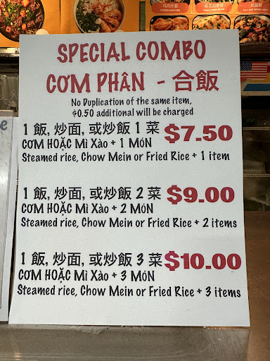 Although the shop serves Vietnamese staples such as pho, bún riêu, and com tam, they are fast-food versions compared to those prepared at sit-down Vietnamese restaurants. The pho broth contained MSG, the bún riêu lacked crab meat/tofu and the tomatoes are too soggy, and since 2011 the com tam no longer includes a piece of cha trung hap (steamed Vietnamese egg meatloaf).