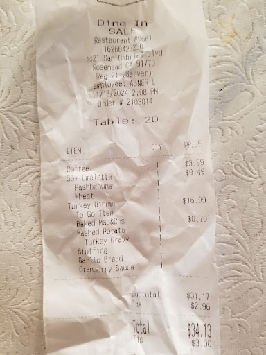 Read moreI was expecting a better service from this restaurant chains. The soon you enter in the place smells funky. Once you sitting, and start realizing that those smells do not coming from a rug. The intensity of those "funky wet rug" smells do not really coming from a rug, because, they do not have even one. The service is not on point. The waitress forgot the pancakes. The glasses come dirty, the food well cooked, but, not the best, just eatable. I will not go back again. Manager needs to put attention in those circumstances. Hopefully, this review helps to other future consumers. P.S. I do have to leave 15% of the tip, for a really, ...
