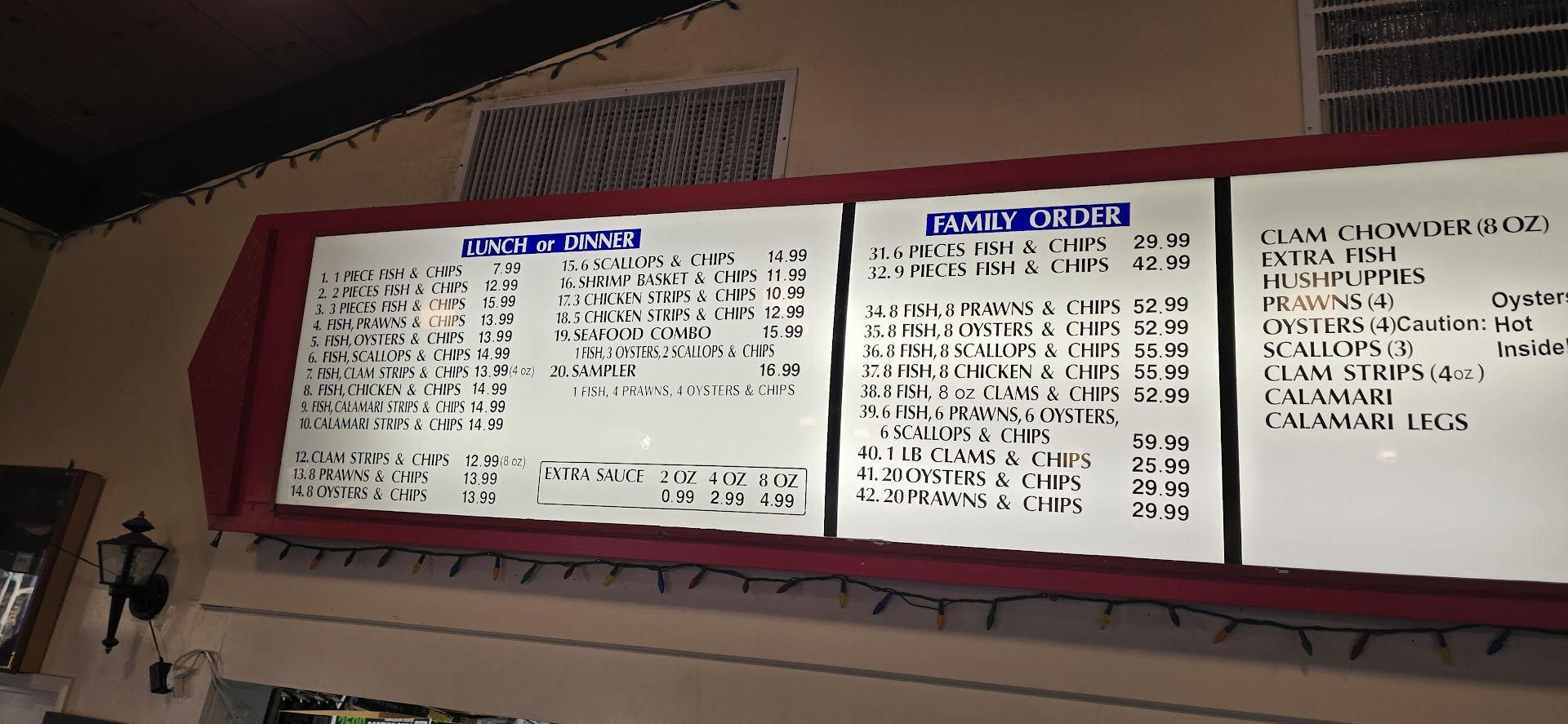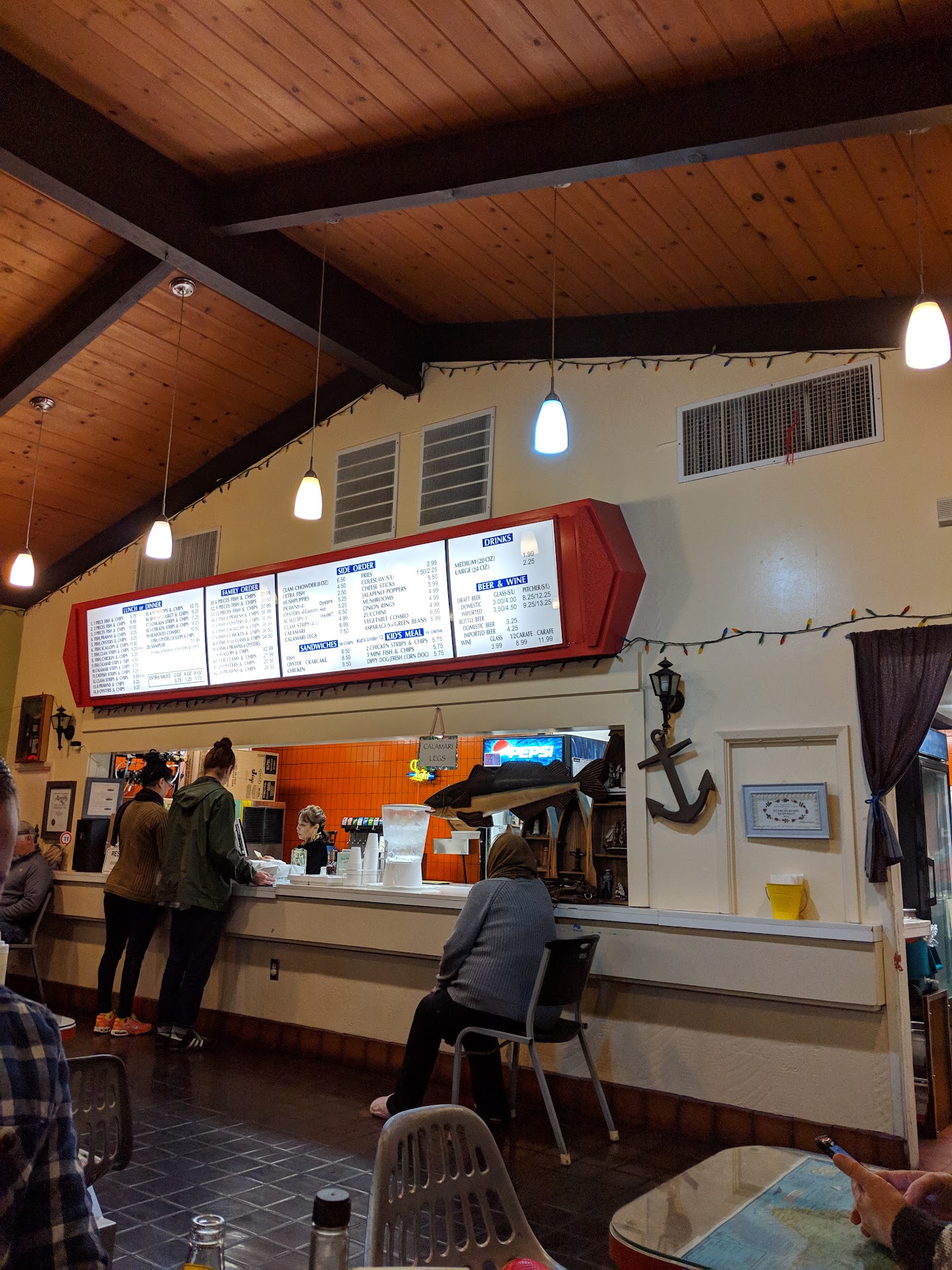 First, I always say "hello how are you" and "please and thank you" and try to be very kind and polite to service industry workers since so many people treat them badly. The woman at the counter wearing a hat and glasses didn't say anything after I said "hi how are you" so I proceeded to order #6 Fish, scallops, and chips. She said back to me "scallop and chips?", So I clarified, "#6 with fish AND scallops please." She rang me up.