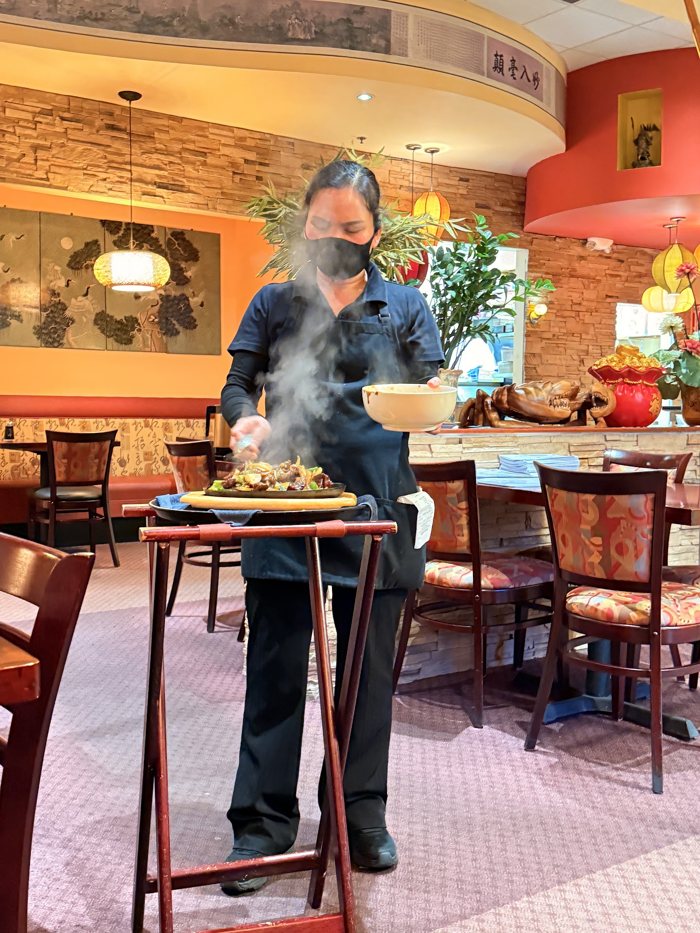 Here are the pluses. I have eaten here many times and I do recommend this fine restaurant. The food is served hot, fresh, and is very good. Here are the minuses. If you order an appetizer it may come before or after your entrees. Your entrees will arrive on the table as they are cooked, one plate at a time, not all at the same time. Minus 1/2 star.