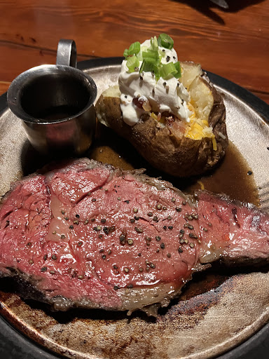 I went with the prime rib, served sizzling hot on a cast iron plate, alongside a loaded baked potato. Erik ordered the New York steak, also with a baked potato. Both steaks were cooked perfectly (medium-well) and full of flavorâHarris Ranch beef truly makes a difference.
