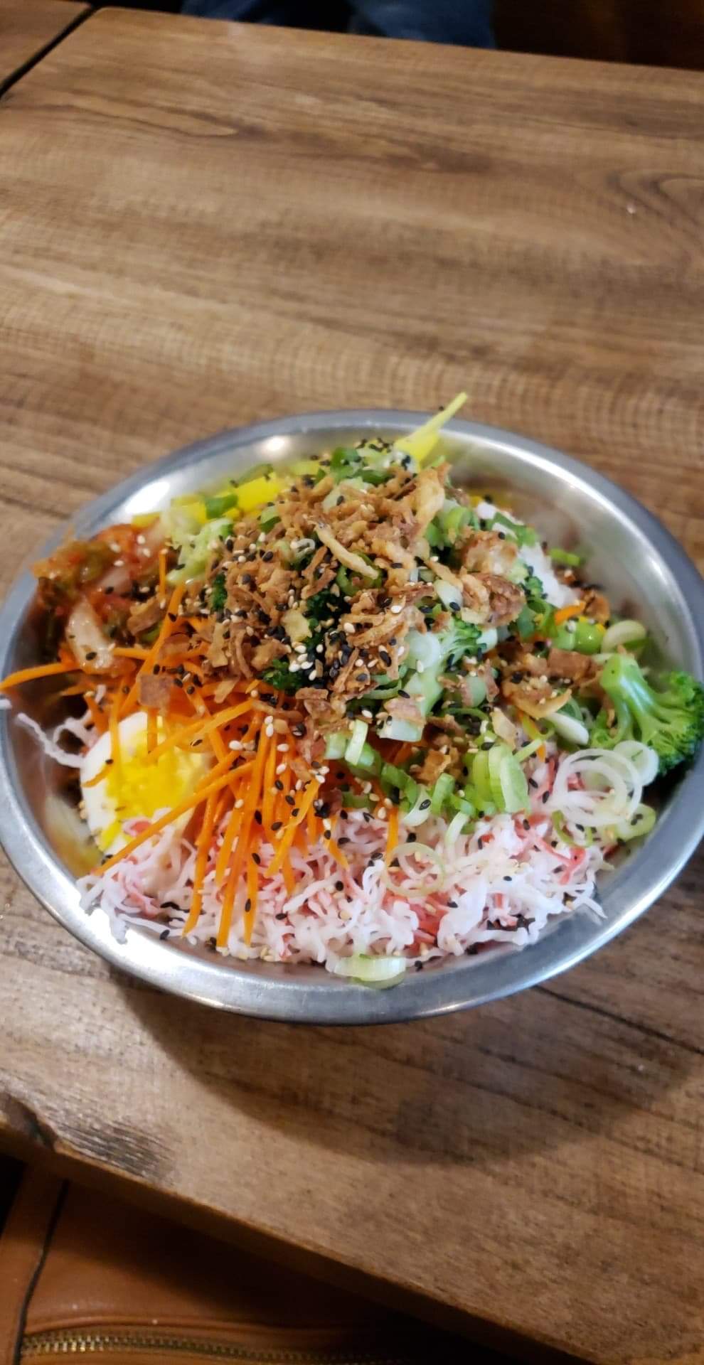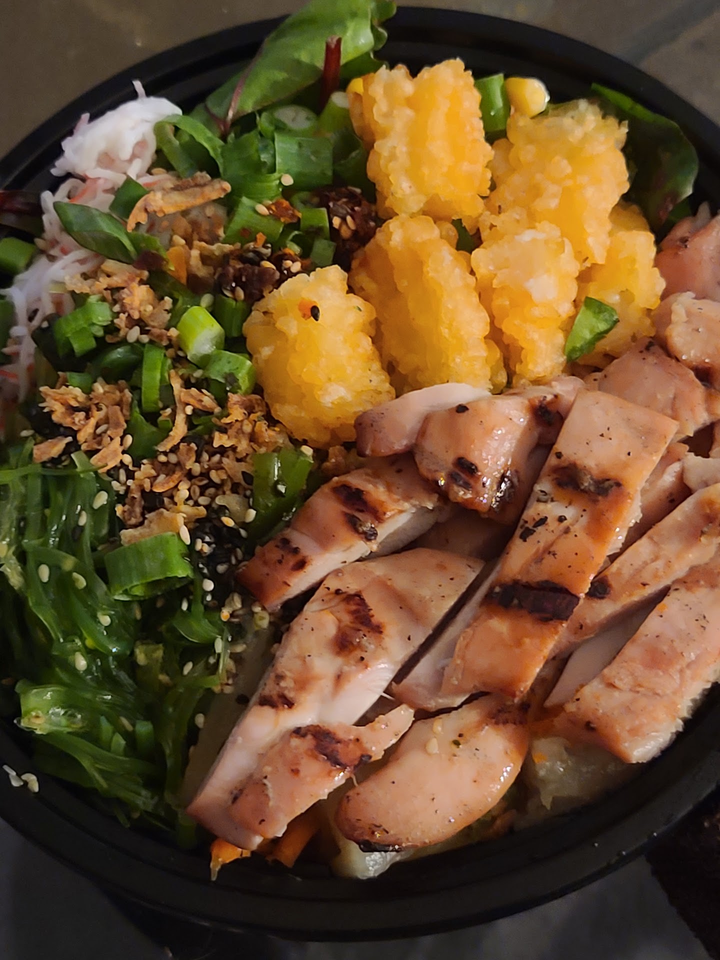 Choose what you want on the bottom...just white rice...brown rice...spring salad mix or half rice half spring mix or wontons...