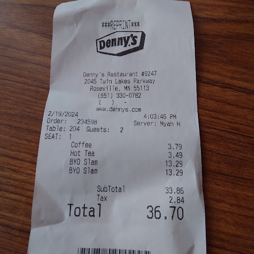 First visit to this location in Roseville, and Myah was the only bright spot of the visit, trying hard to bridge the obvious gaps. One such gap was the cleanliness of the restaurant and booth we occupied that had a thick layer of filth on the surface. We used our own sanitizer and one of our napkins to attempt to remove the filth and scum from our booth table surface. Myah apologized as she returned to take our order, and offered to remove the filthy caked napkin...somewhat defeated as if this was not a rare occurrence. Our choices from the menu were reduced by almost 50%, with page after page (note photos) of menu items covered by a sticky label that read "Out of Stock." When we asked Myah what was going on, as we've NEVER encountered anything like this at another Denny's, she responded with an an matter of fact..."It's out of Stock." A flat statement her manager in all likelihood told her to say. There is simply no excuse for this, and the manager should be hung up by his or her thumbs, and then booted out the door!! The owner of this franchise is losing money hand over fist with many probably simply walking out of the restaurant when there is such a limited option to order. The food we finally received was average at best, and during the bulk of our visit the cooks were huddled around the bar area in front of the kitchen checking their phones, and talking to each other in spanish. To say someone is asleep at the wheel for this Denny's location, is the most generous assessment I can offer. If corporate oversight and intervention is an option, it should be closed and everyone should be retrained. Establishing a new management team is the most obvious solution to affect long-lasting change, so customers receive the experience they deserve. I do not recommend visiting this restaurant, unless you are hankering for...