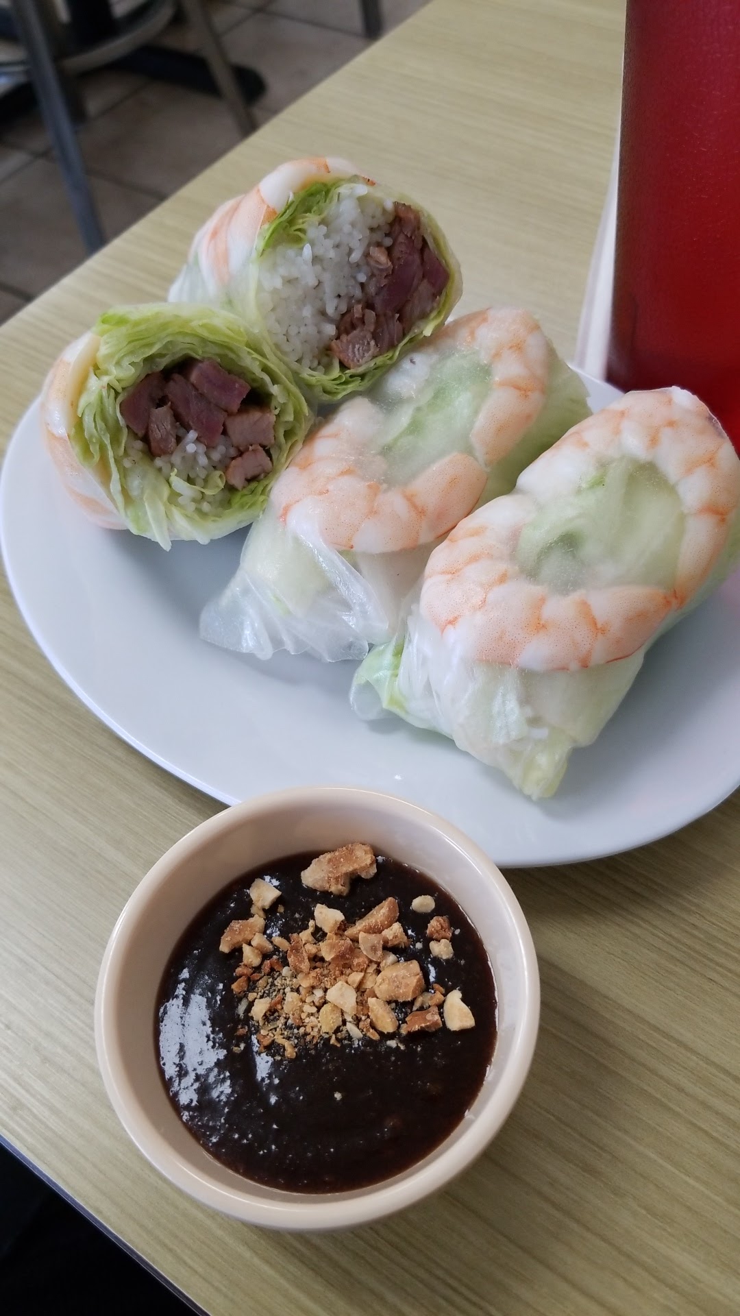 Read morePlenty of parking out front due to it proximity to shopping center. Decor is utilitarian. We ordered deep fried shrimp wrap $12, tofu banh mi $11, small pho dac biet $14, com thit tom grilled $17. The fried shrimps are a bit over doneness, tofu banh mi was probably wrong choice; cold meat sandwich typically a go to in Vietnamese food settings. Grilled pork and shrimp are ok. Pho is good enough to satisfy my long craving. Oh, the suggested tip is 18% with the rising cost of food now-a-day? When did the American thinks serving customer food in their restaurant needs tipping? They should be smiling, graciously, quickly serve customer their food as it’s their only business. Unless the chef dings the bell and customer pick up the food, otherwise serve what customer order without...