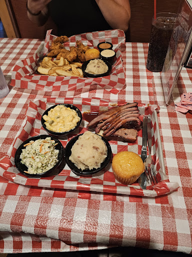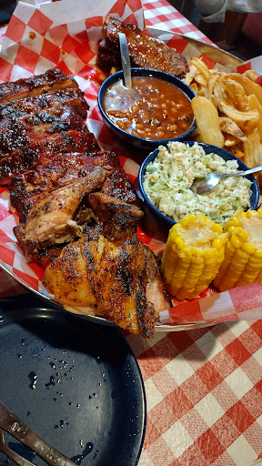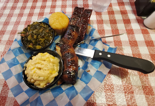 Read moreThe host arrived about a half minute after I did and quickly showed me to a seat. I had a few minutes to peruse the menus before the server arrived and took my drink and meal order. Ordered the Two Meat Combo with an extra side (only $2.49 extra) because I couldn't decide between Mac & cheese and the collard greens. Picked ribs and sausage for the meats. Collard greens are good, different flavor than I've had previously, but solid. Interestingly, the mac & cheese has corn in it. Not bad, just different. Very creamy and delicious. The ribs were good. Not falling off the bone but tasty. The sausage was big and juicy with decent flavor pre-sauce. The cornbread muffin was a little bland but seriously moist. The Wilbur's Revenge sauce, their hottest, while very spicy, has an odd powdery aspect to it. You'll give up the heat and get better flavor with the Devil's Spit sauce instead. The music was at a proper volume. But I'm curious why BBQ places feel the need to play only country music. It certainly ties in with the checked tablecloths and the wood everywhere but BBQ is enjoyed by fans of jazz, rock, heavy metal, classical, reggae, et al. The cliché is worn out. Decent quantity of food for the price but the quality...